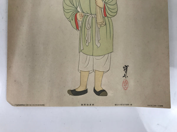 This vintage Japanese print reproduction features Daikokuten, or Daikoku, one of the Seven Lucky Gods. Daikokuten, the god of commerce and wealth, is depicted as a standing man with an empty sack, which is unusual for this god. This type of print is a gift that comes with magazines or newspapers.