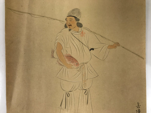 This vintage Japanese print reproduction features Ebisu, one of the Seven Lucky Gods. Ebisu is carrying a fishing rod and holds a red fish, likely a carp, in one of his hands. This type of print is a gift that comes with magazines or newspapers.