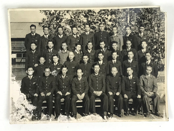 This is an original vintage Showa Era portrait photograph of a group of staff in black and white. The uniforms suggest these well-dressed men are instructors/graduates of a railway academy.