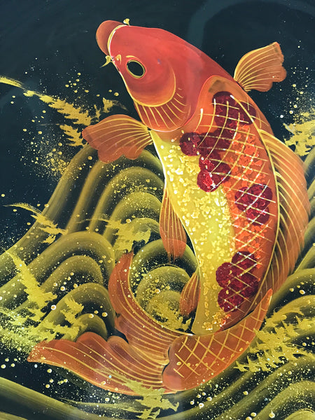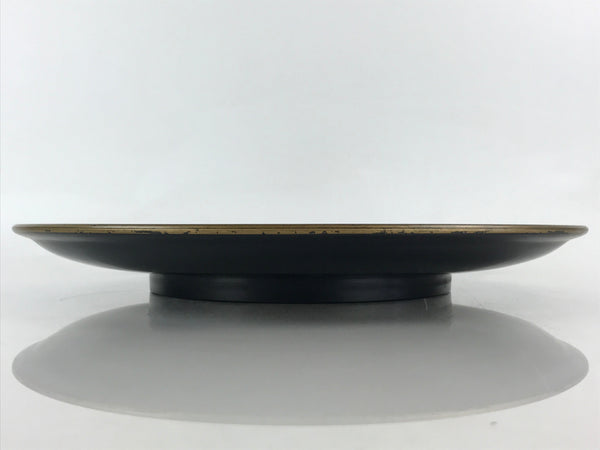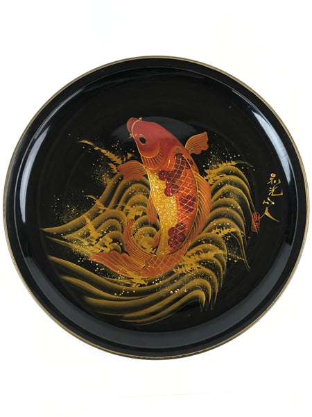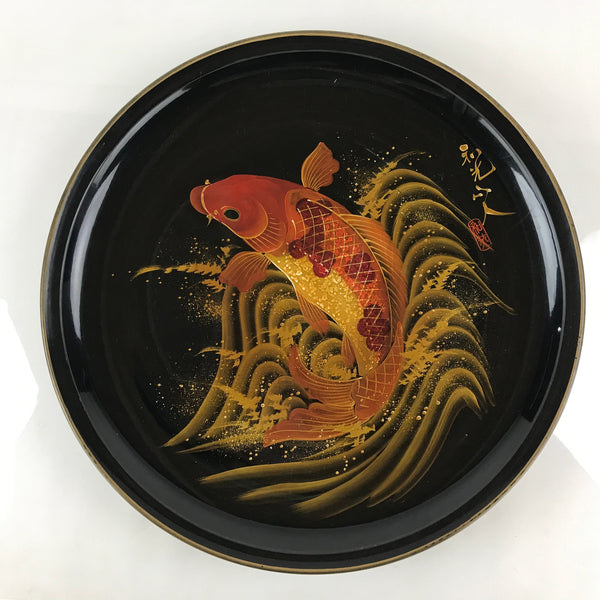 Japanese Lacquer Replica Large Serving Tray Vtg Koi Carp Obon Black Round L14