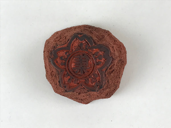 This is a Japanese vintage rubber stamp attached to a sponge-like base. The stamp features a cheery blossom with a Japanese character at its center. The sponge base has hardened. This stamp can be used as it or you can remove the rubber to place it on another base.