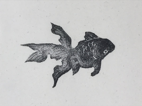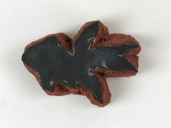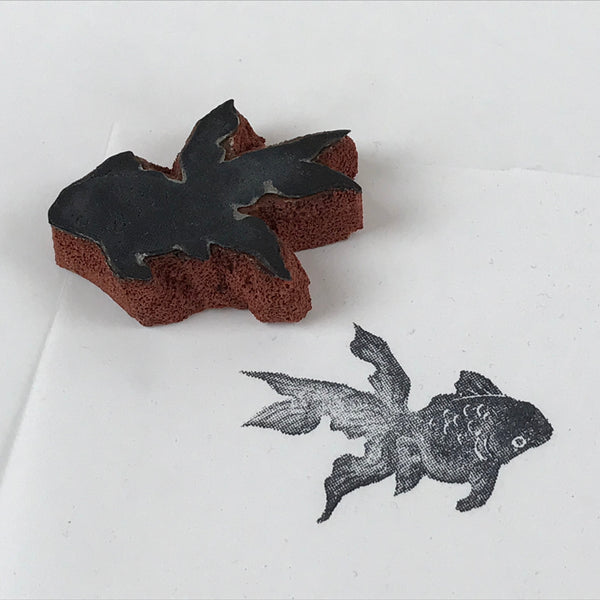 This is a Japanese vintage rubber stamp attached to a sponge-like base. The stamp features a goldfish with long tails. The sponge base has hardened. This stamp can be used as it or you can remove the rubber to place it on another base.