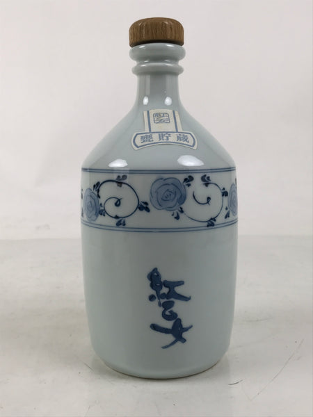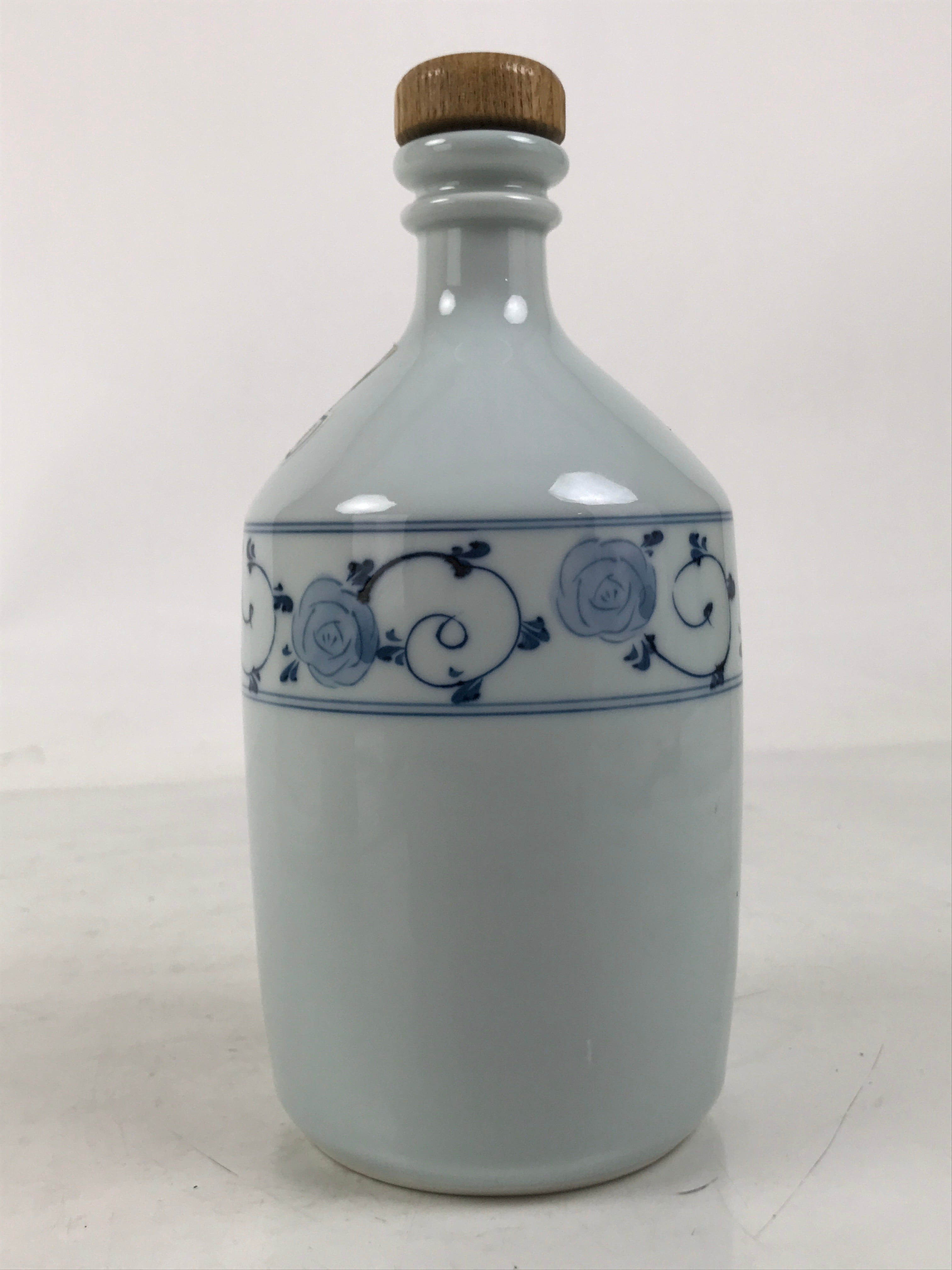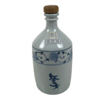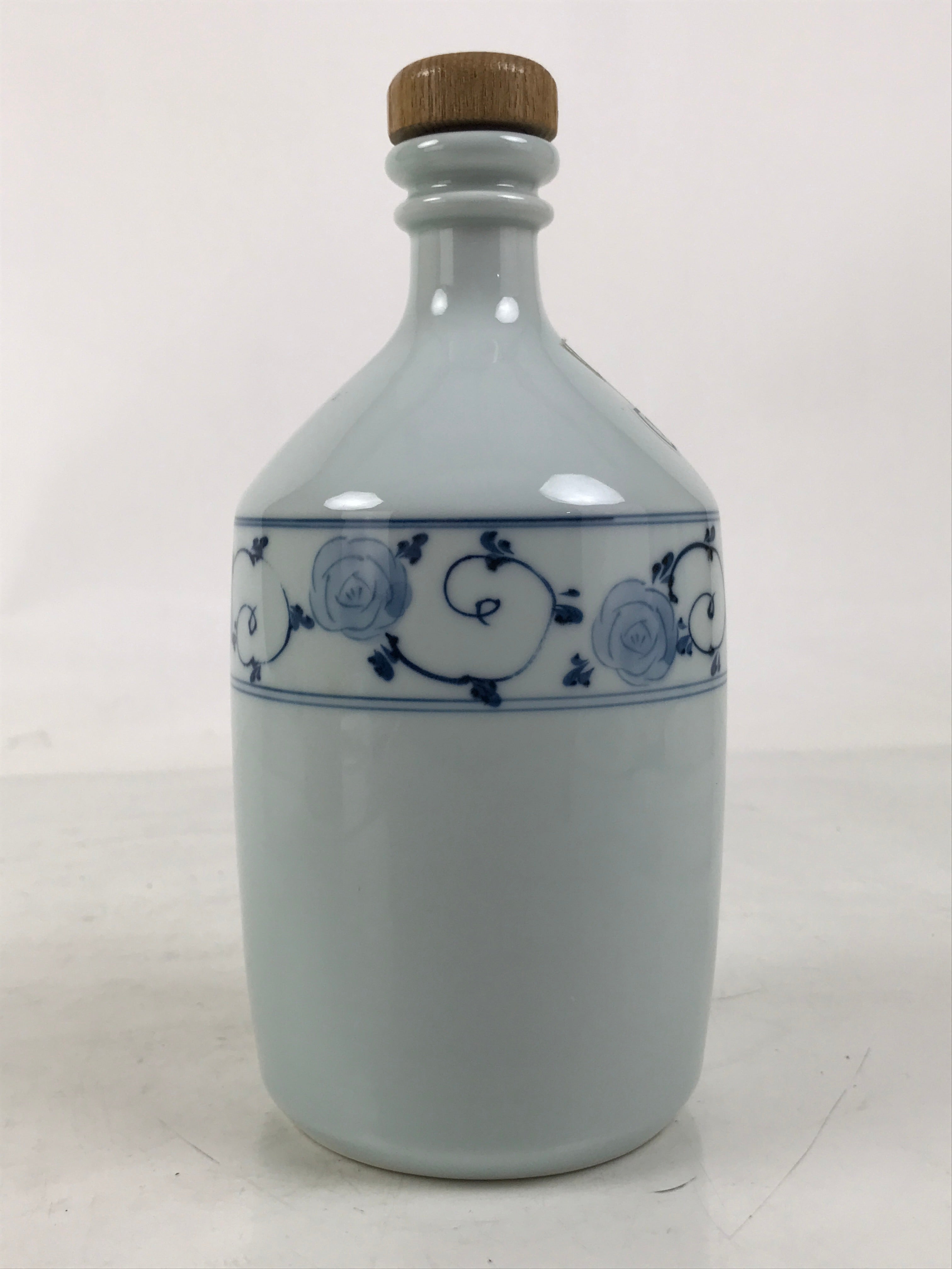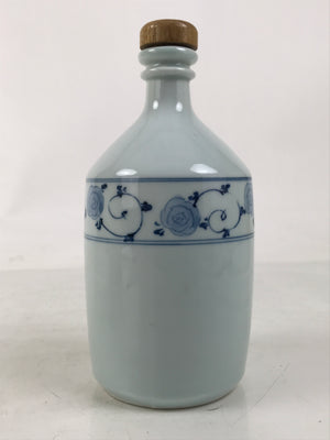 This is a vintage Japanese ceramic sake bottle. It is called a Kayoi-Tokkuri and is used to pour sake. The commuting sake bottle became popular as a rental container for liquor stores in the Edo period when sake began to be consumed on a daily basis. This white bottle has a blue decorative floral pattern and blue characters. It has a matching wooden cork.