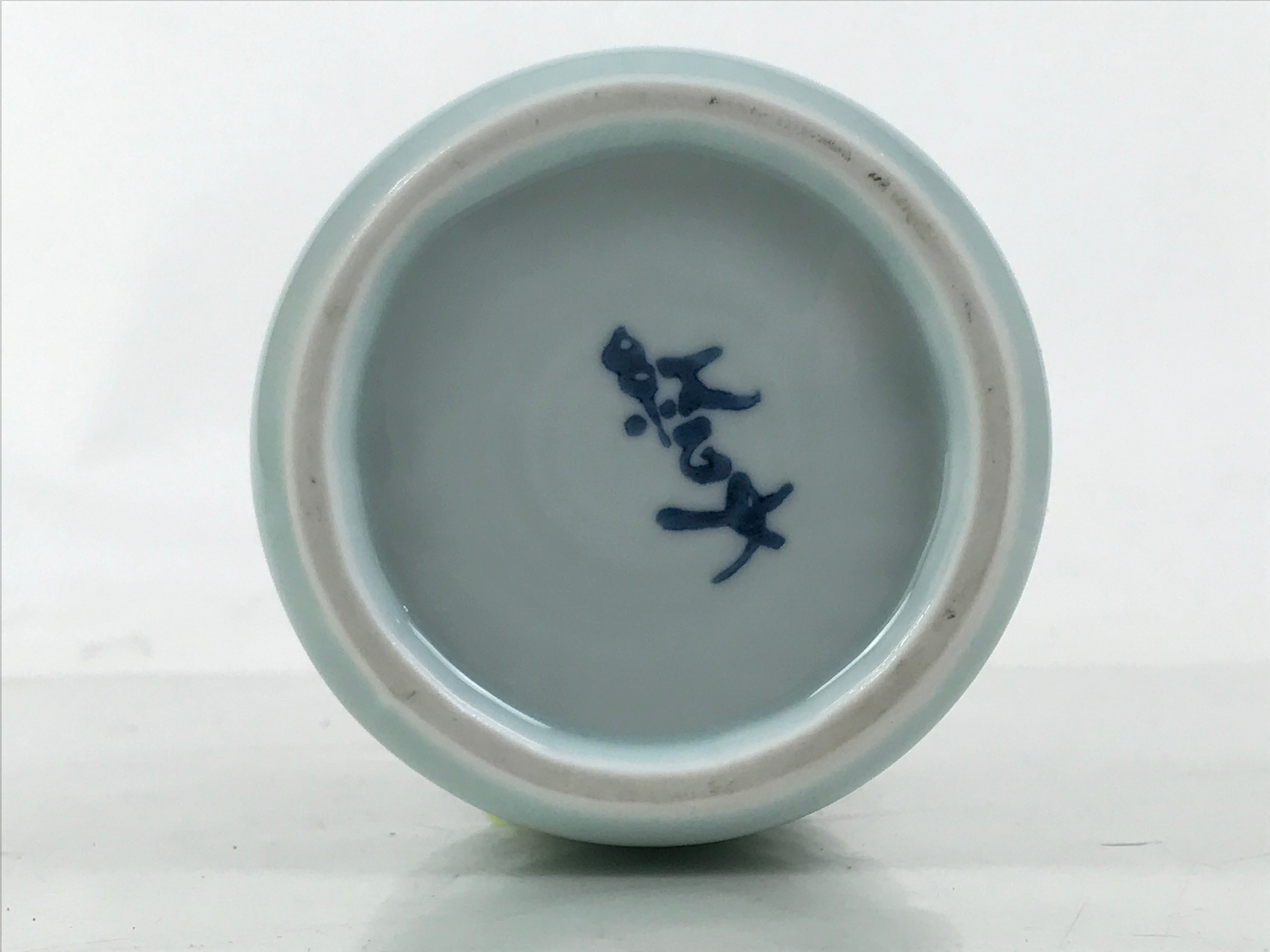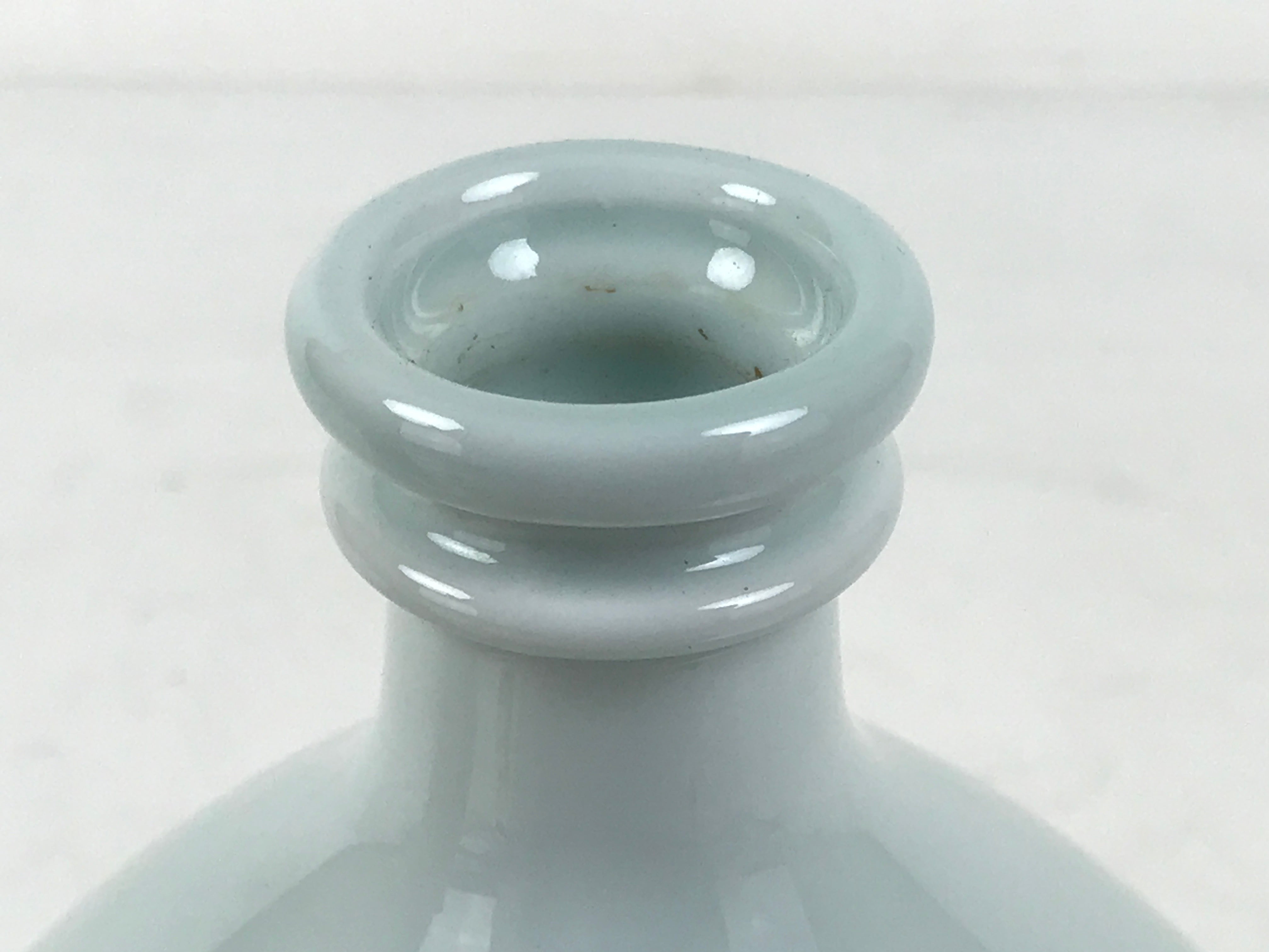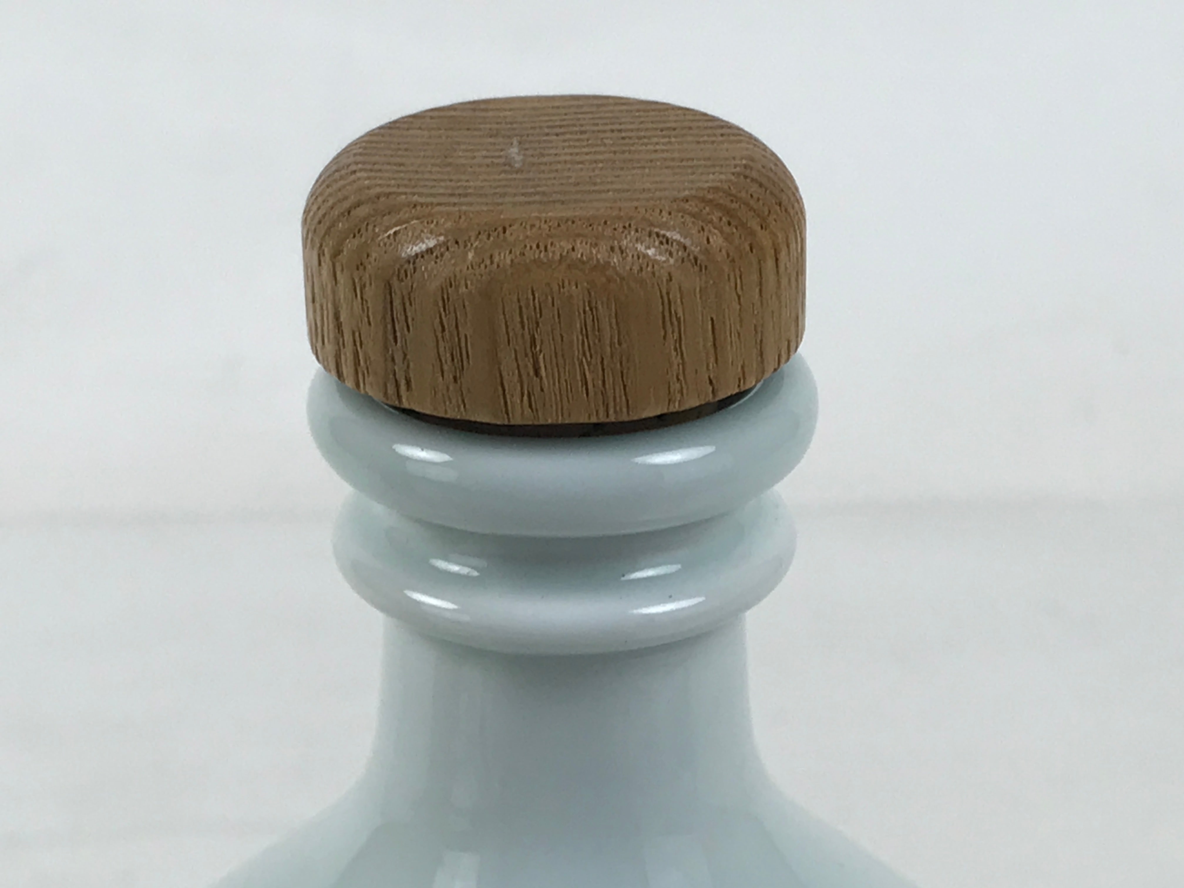 This is a vintage Japanese ceramic sake bottle. It is called a Kayoi-Tokkuri and is used to pour sake. The commuting sake bottle became popular as a rental container for liquor stores in the Edo period when sake began to be consumed on a daily basis. This white bottle has a blue decorative floral pattern and blue characters. It has a matching wooden cork.