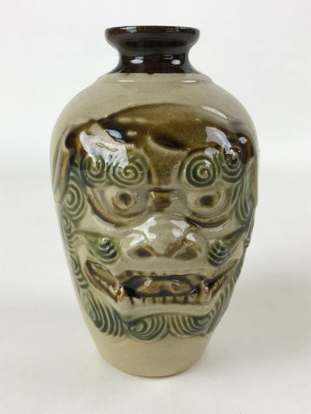 This is a vintage Japanese ceramic sake bottle or Tokkuri. With a raised image of a shishi lion dog on one side and a dragon on the other, this tokkuri is beige with a brown and green accent. It is a sango or yongo size sake bottle. It can be also used for water or as a vase.
