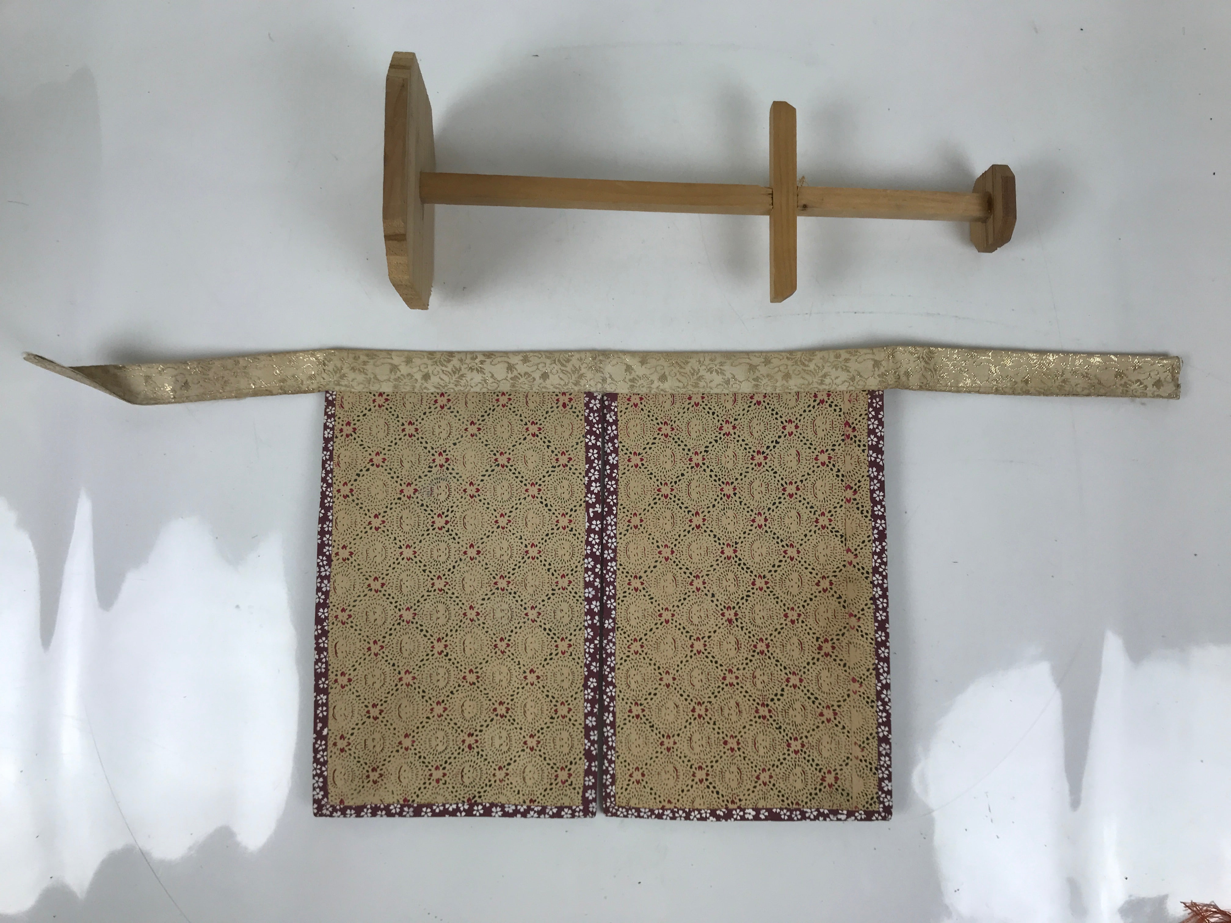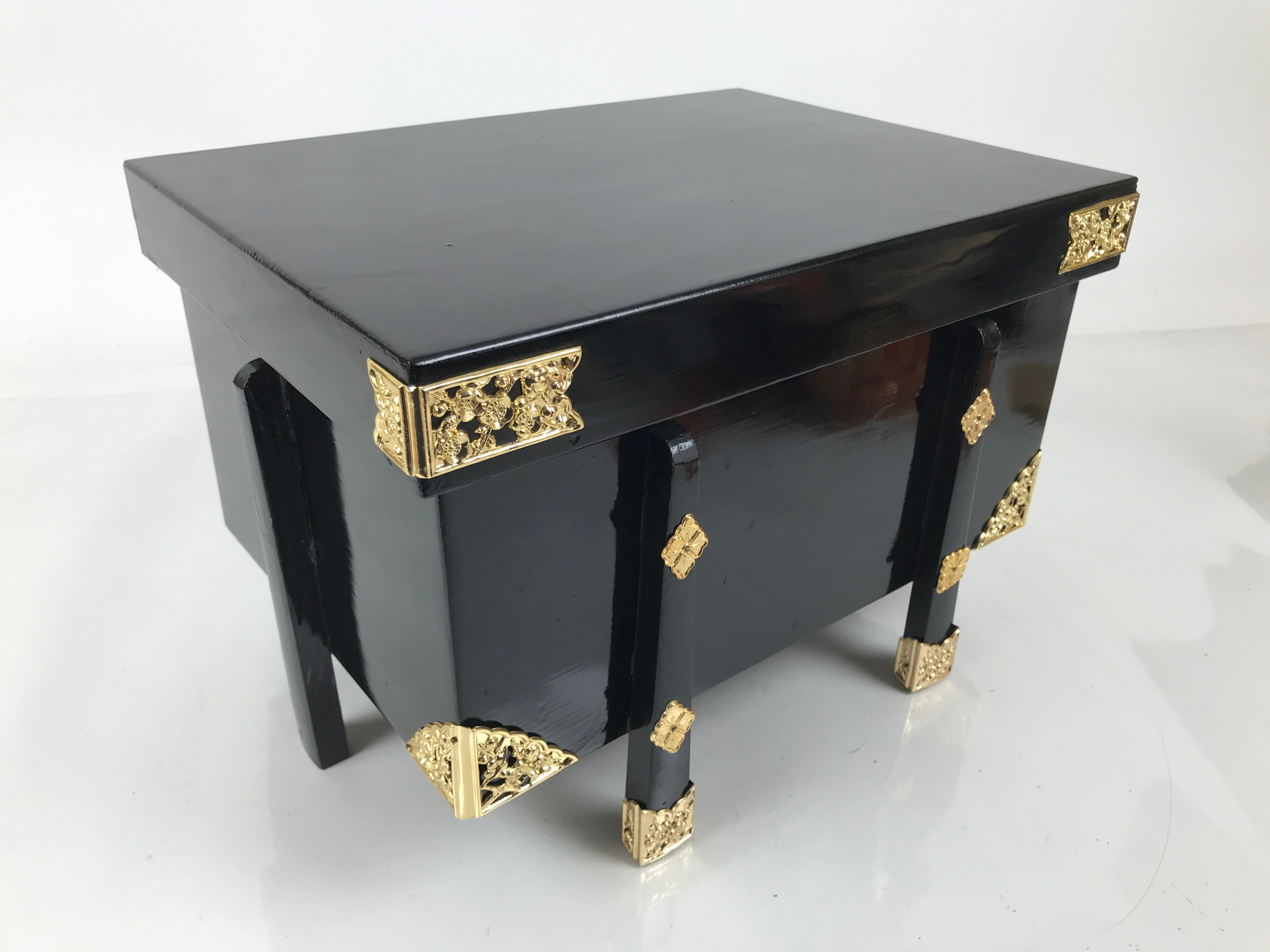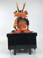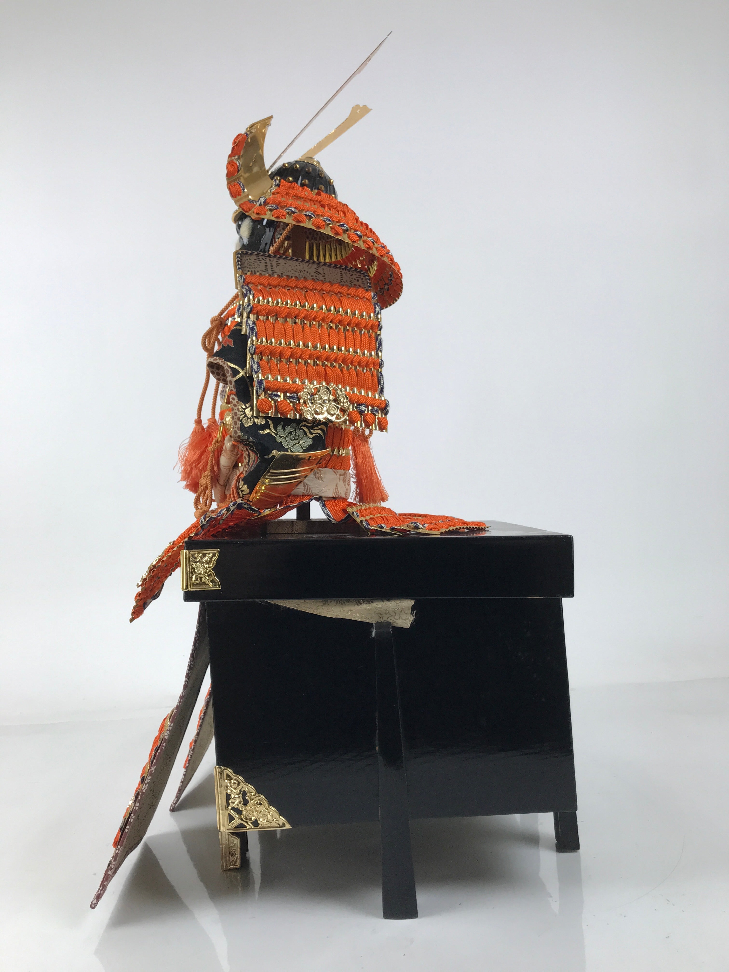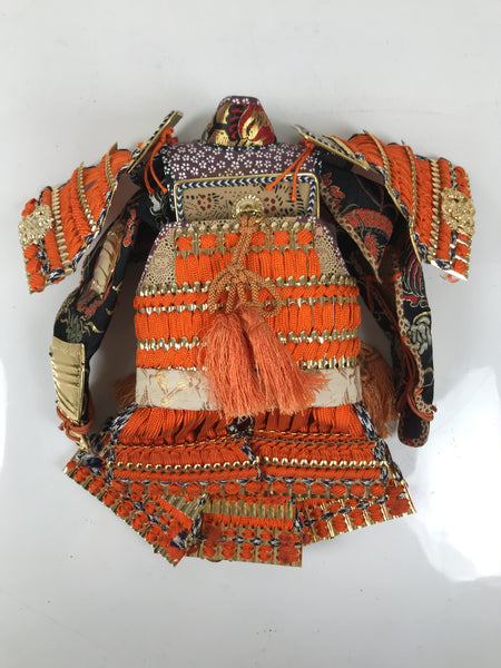 This is a vintage miniature samurai armor (Yoroi) set used for display decoration during the Boys' Festival. It is housed in a glossy black lacquered wooden box with gold metal decorative plates. It contains multiple pieces including: Helmet and finials, mask, body piece, draping bottom panels, shoes, shinguards, and a wooden stand. The armor features floral and crane designs and crafted from gold-colored metal pieces and bright orange cords. Overall, this piece is orange, beige, and gold. The box paired with the stand creates the illusion of a seated armored man. It comes with the original paper box.