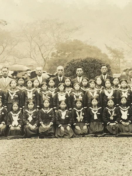 This is an original vintage Showa era photograph of a class of students in a soft sepia tone. The girls wear sailor fuku uniforms, while the boys also wear traditional uniforms. The teachers all wear suits with the exception of the two elderly women on the right side. They are posed in front of the first torii gate and bridge of Ise Grand Shrine in Mie Prefecture.