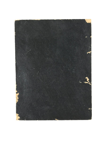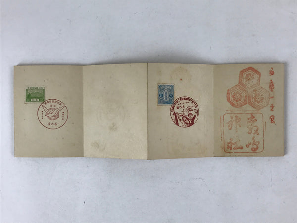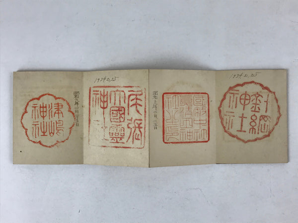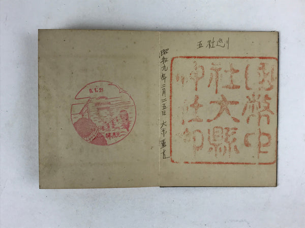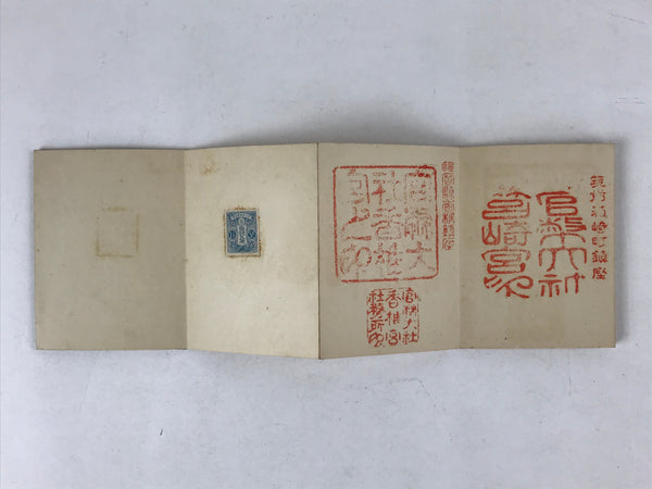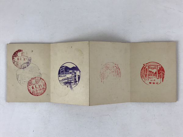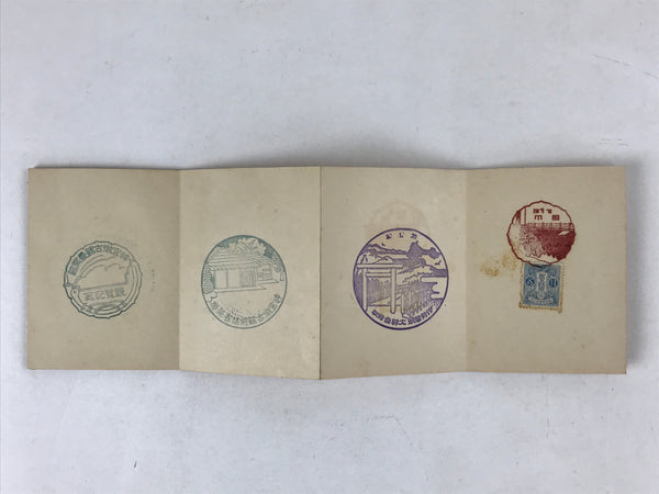 This is a vintage Japanese seal stamp (shuin) book. Seal stamps are given to visitors at temples, shrines and other locations. This accordion style book is a collection of stamps and features stamps from shrines as well as ropeways. This book has been filled between 1930 and 1940. It has a black cover with a handwritten title.