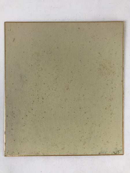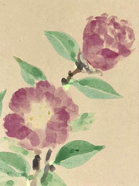 This item is a vintage hand-painted shikishi art board. It features stems of blooming camellia flowers with soft light green leaves on a light brown background.