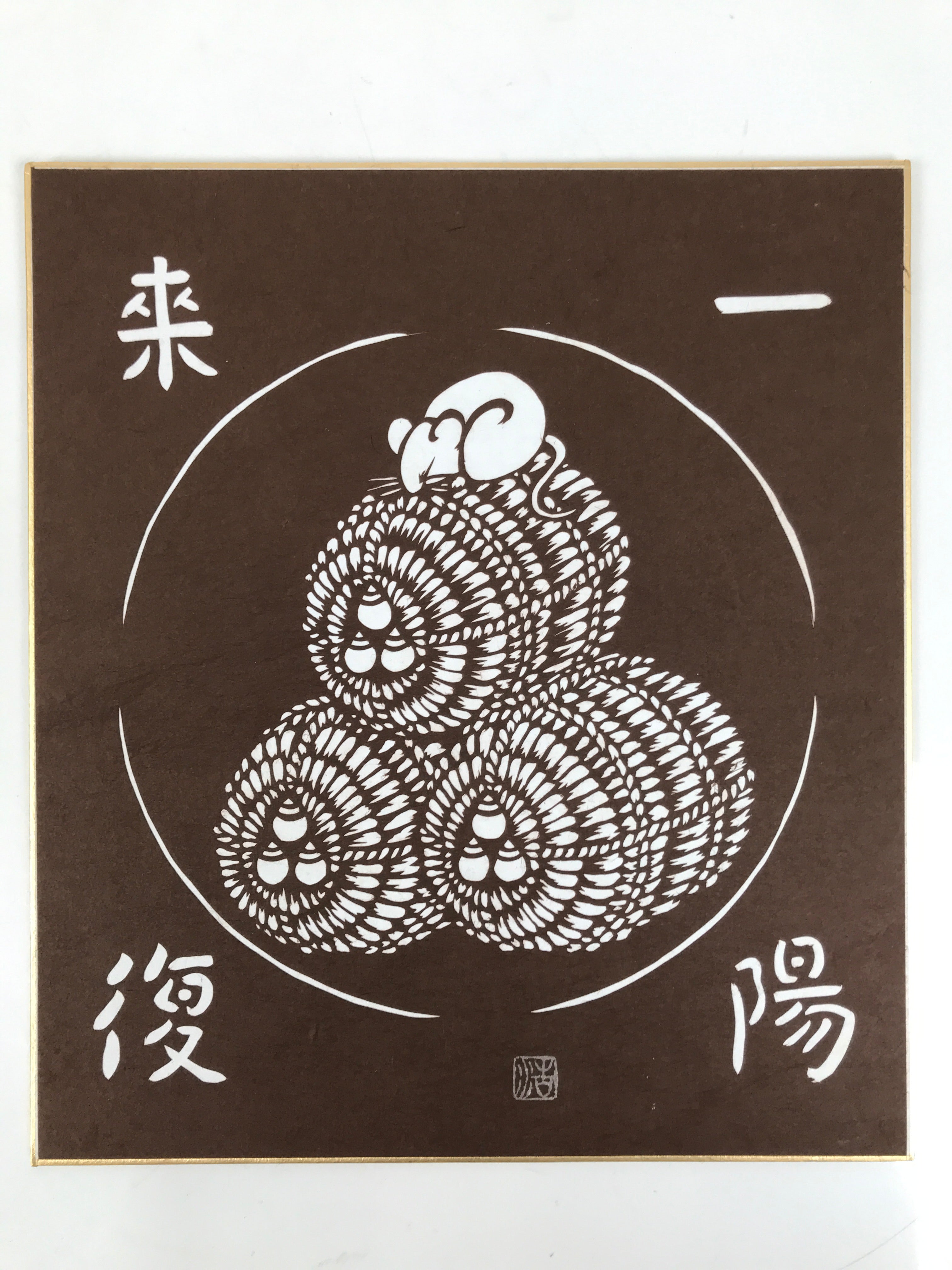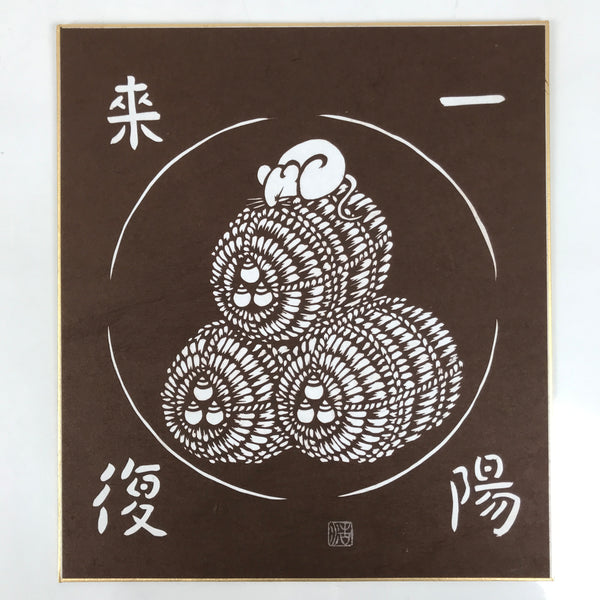 This vintage Japanese shikishi features a Katagami cutout picture of a mouse on rice barrels, a lucky motif in Japan, with a four-character idiom. This is a cutout picture of the year's zodiac. This piece is signed with names and red seals.
