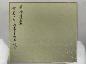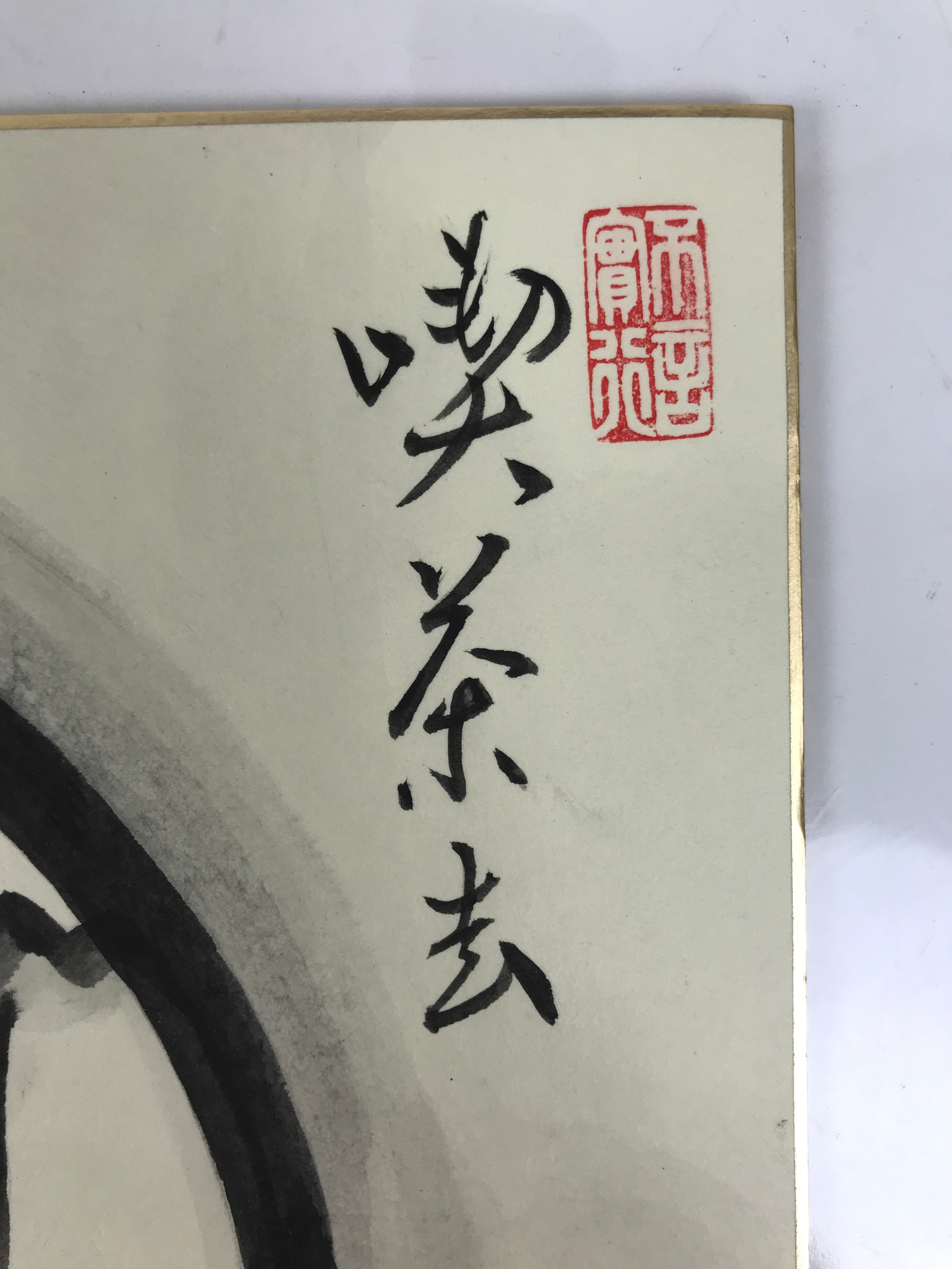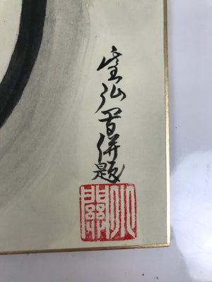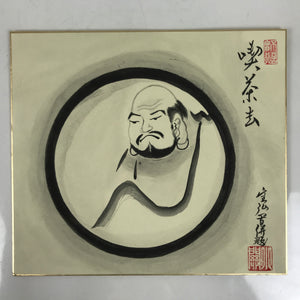 This vintage Japanese shikishi art board features a portrait of Bodhidharma, or Daruma in Japanese. It is hand-painted in a simple black-and-white style. This shikishi has writing and is signed with a red seal.