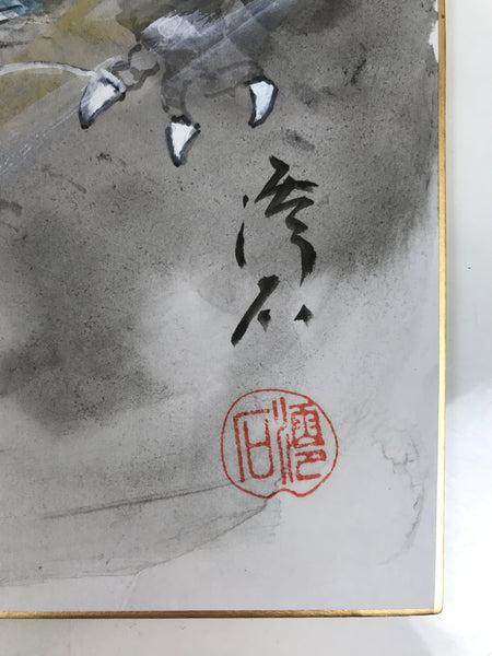 This vintage Japanese shikishi hand-painted art board represents a dragon flying in gray and gold thunderclouds. The dragon's head and one of its front feet are painted clearly, and its body is vague behind the cloud. The dragon's eyes are gold and seem to stare at something sharply. From the writing on the back, this is a painting of the year's zodiac. This piece is signed with names and red seals. There is some writing with a name card on the back.
