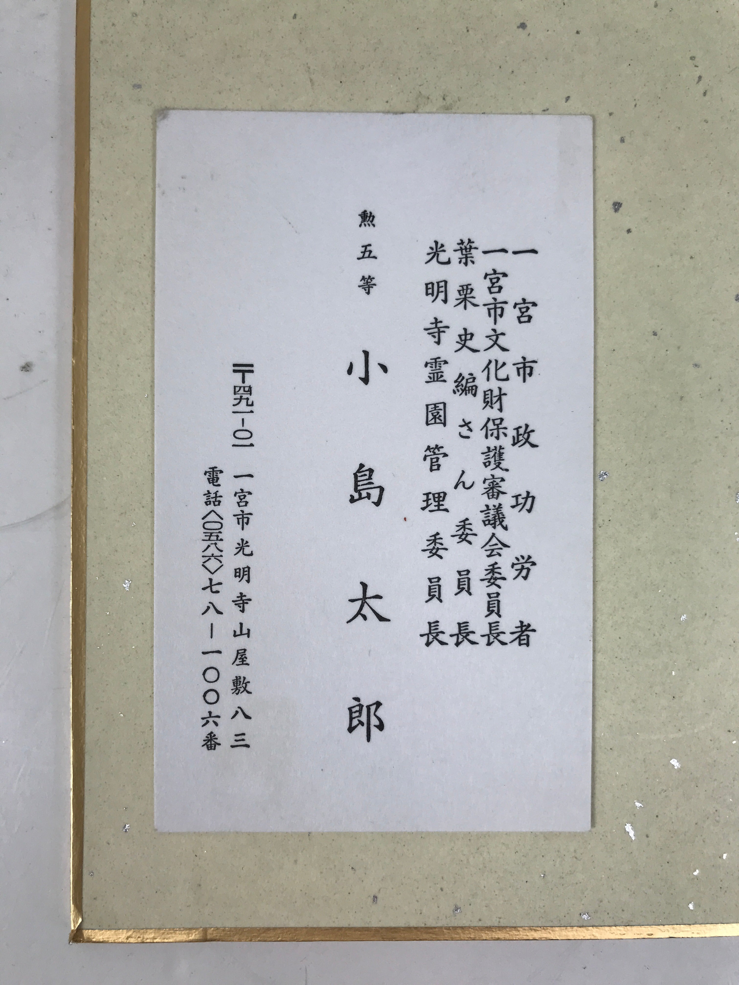 • Name card: 一宮市政功労者 contributor for Ichinomiya city municipal government, 一宮市文化財保護審議会委員長 a chairperson of Ichinomiya city cultural assets protection council, 葉栗史編さん委員長 Editor-in-Chief of the editorial committee for Haguri history book, 光明寺霊園管理委員長 a chairperson of the administration committee for Komyo-ji temple cemetery, 勲五等 kungoto award name, 小島 太郎 Kojima Taro male name