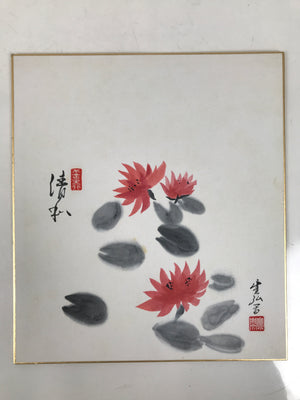 Japanese Shikishi Art Board Painting Vtg Lotus Flower Red Leaf Black Blank A716