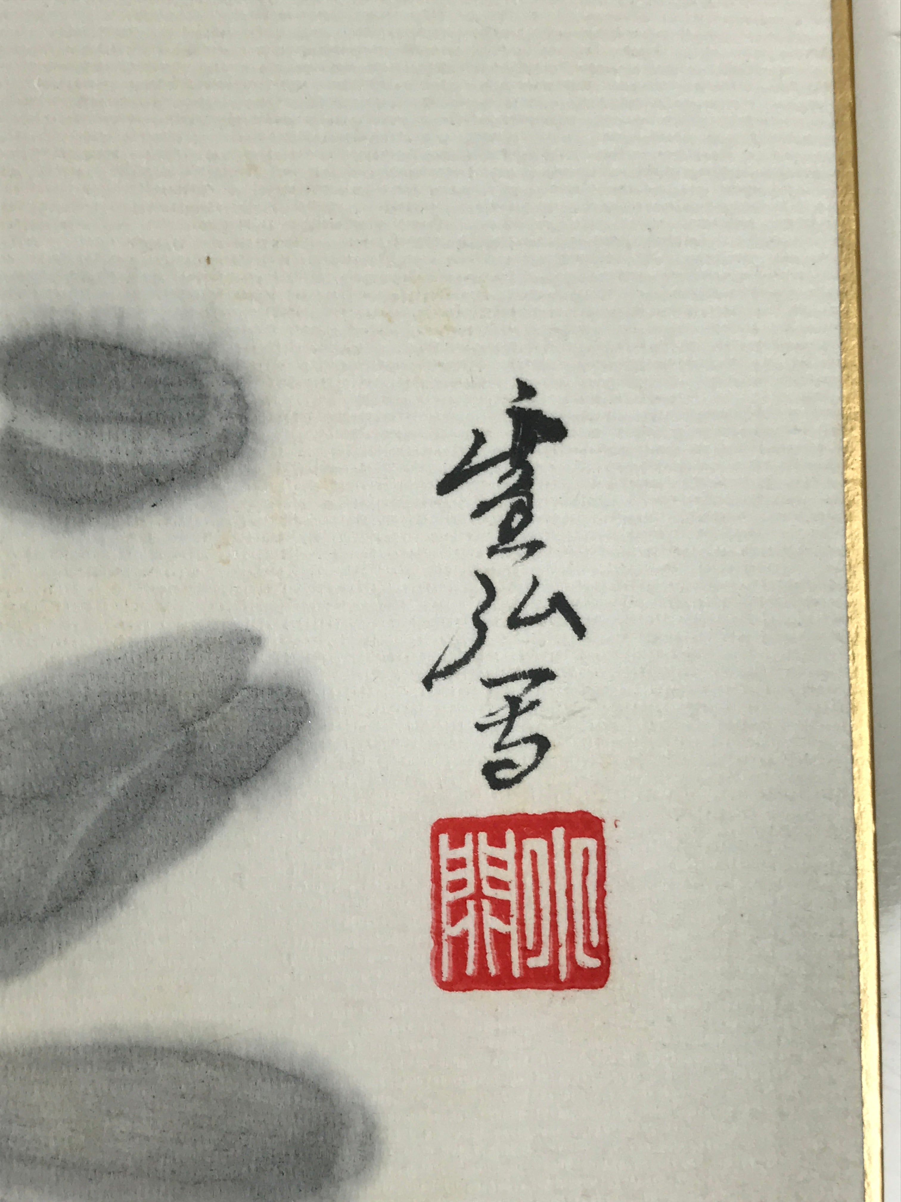 This vintage Japanese shikishi hand-painted art board features lotus flowers and leaves in red and black. The vague outlines of leaves seem to describe them floating on water, and a lot of blank behind the painting might mean calm water. This shikishi has writing and is signed with a red seal.
