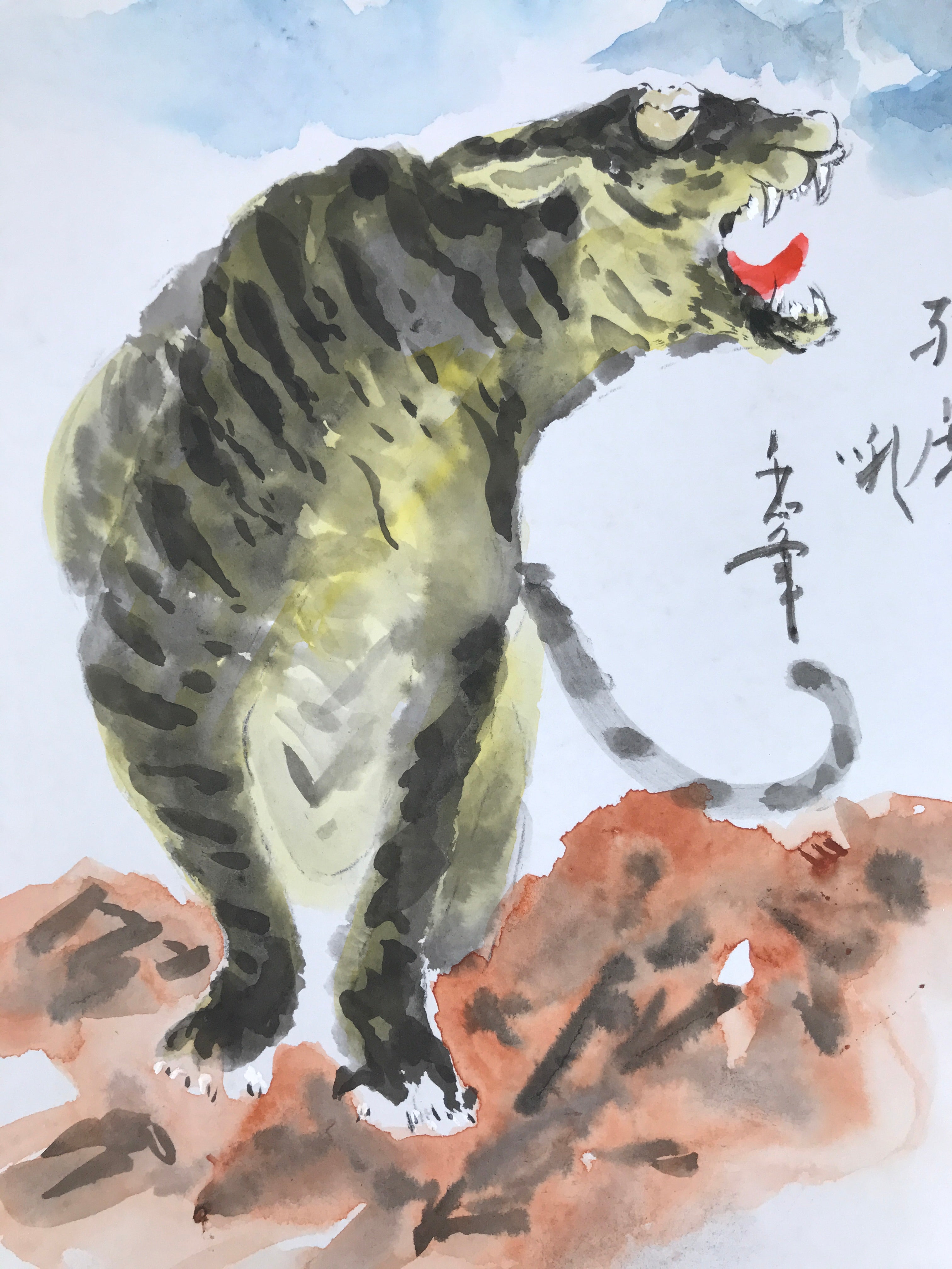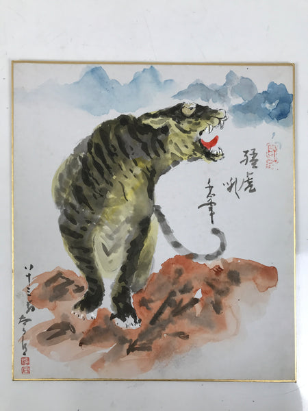 This vintage Japanese shikishi hand-painted art board represents a tiger roaring in a mountainous area. The ground where the tiger stands is red, and the distant mountains are blue.  This is a painting of the year's zodiac from the writing on the back. This piece is signed with names and red seals. There is some writing on the back.