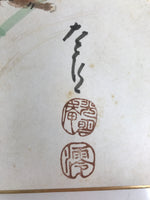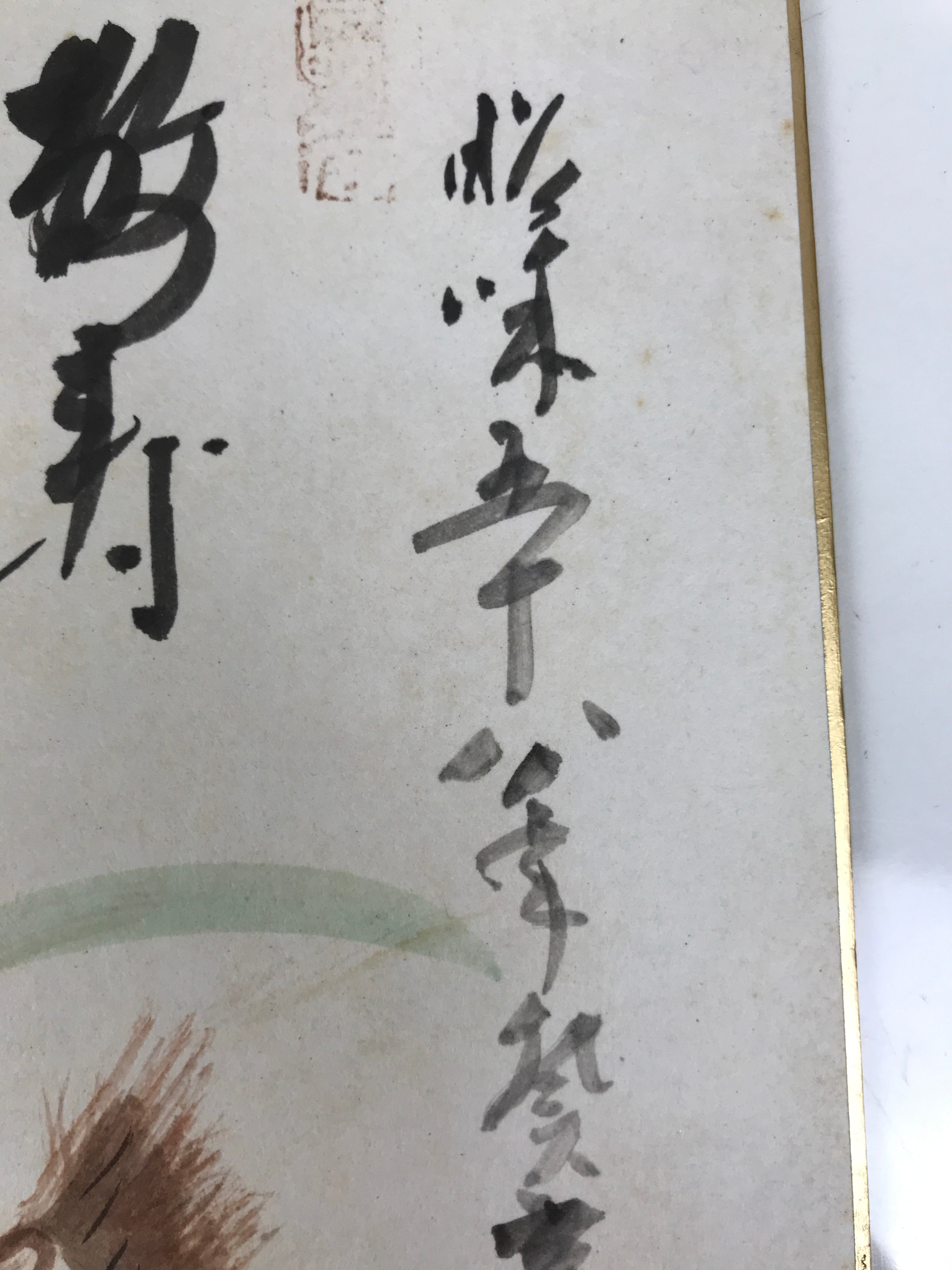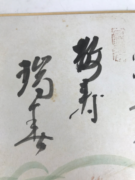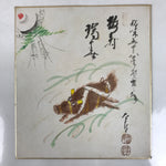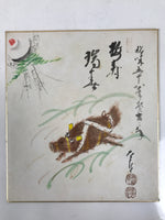This vintage Japanese shikishi hand-painted art board represents a wild boar running over a green field with some Kanji letters. This is a painting of the year's zodiac. This piece is signed with names and red seals.