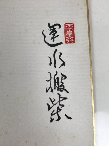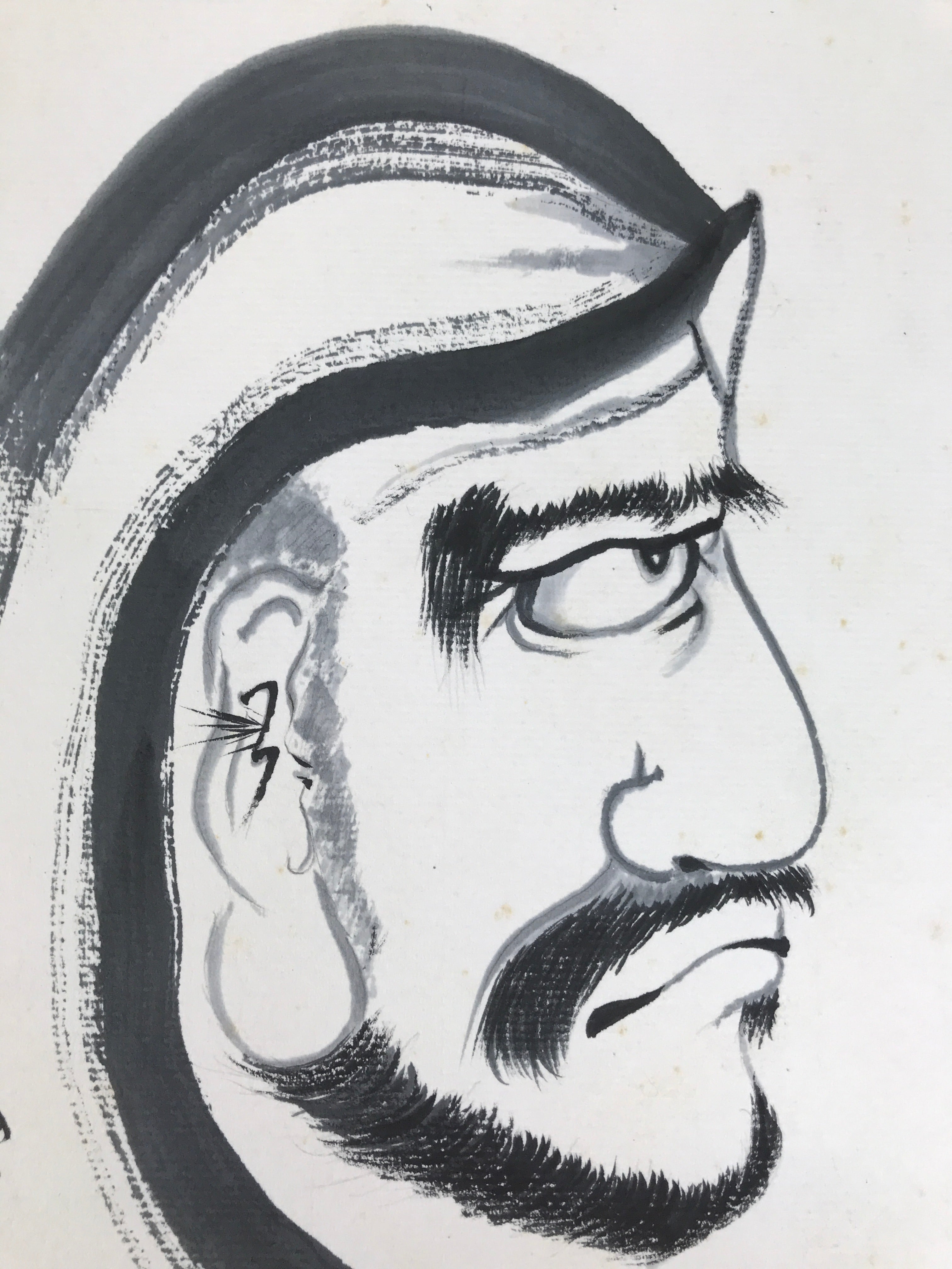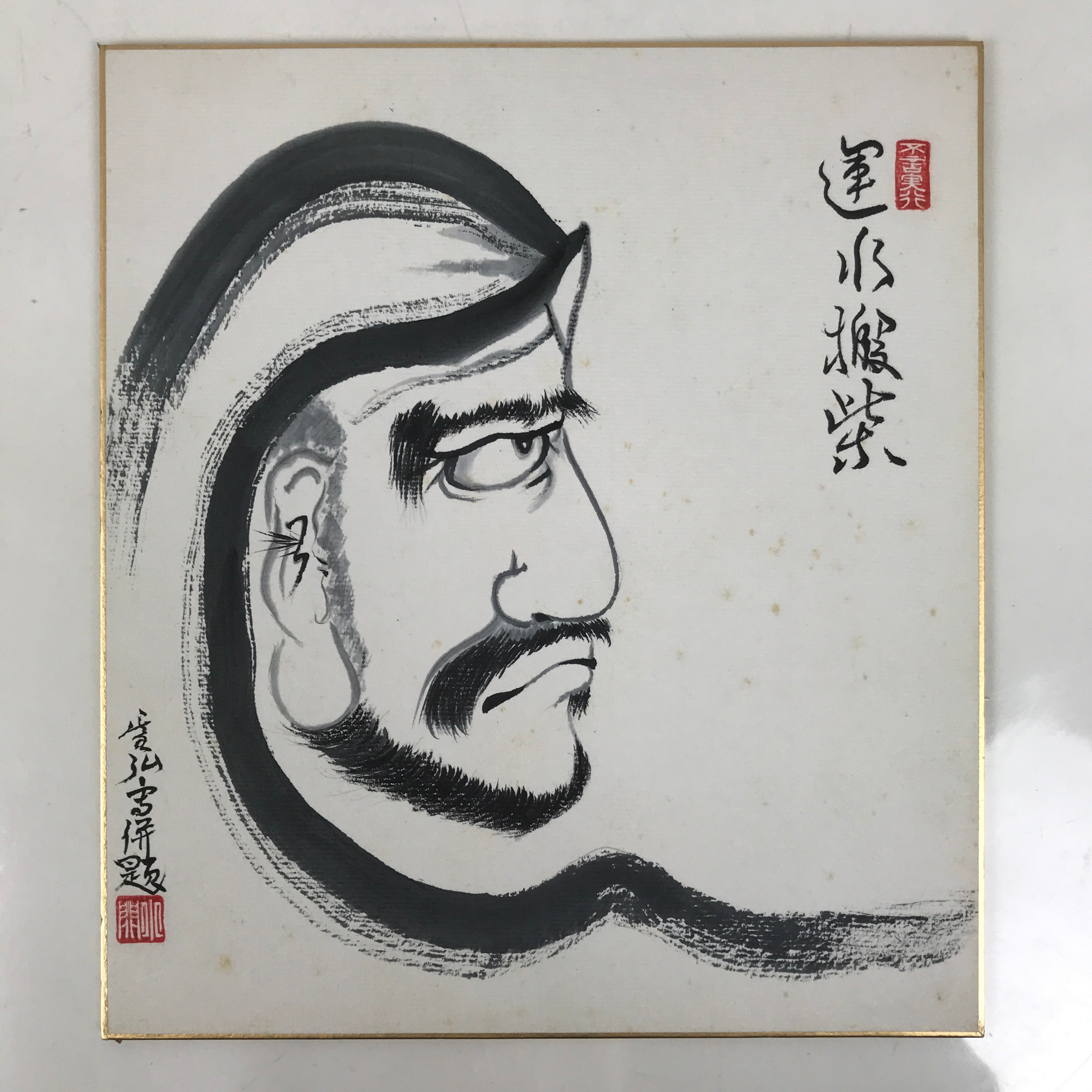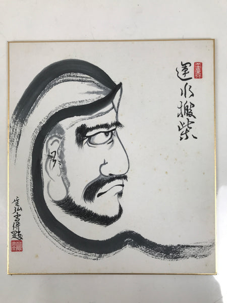 This vintage Japanese shikishi art board features a facial profile of Bodhidharma, or Daruma in Japanese, with a four-letter idiom. It is hand-painted in a simple black-and-white style. This shikishi is signed with a red seal. There are some writings on the back.