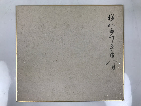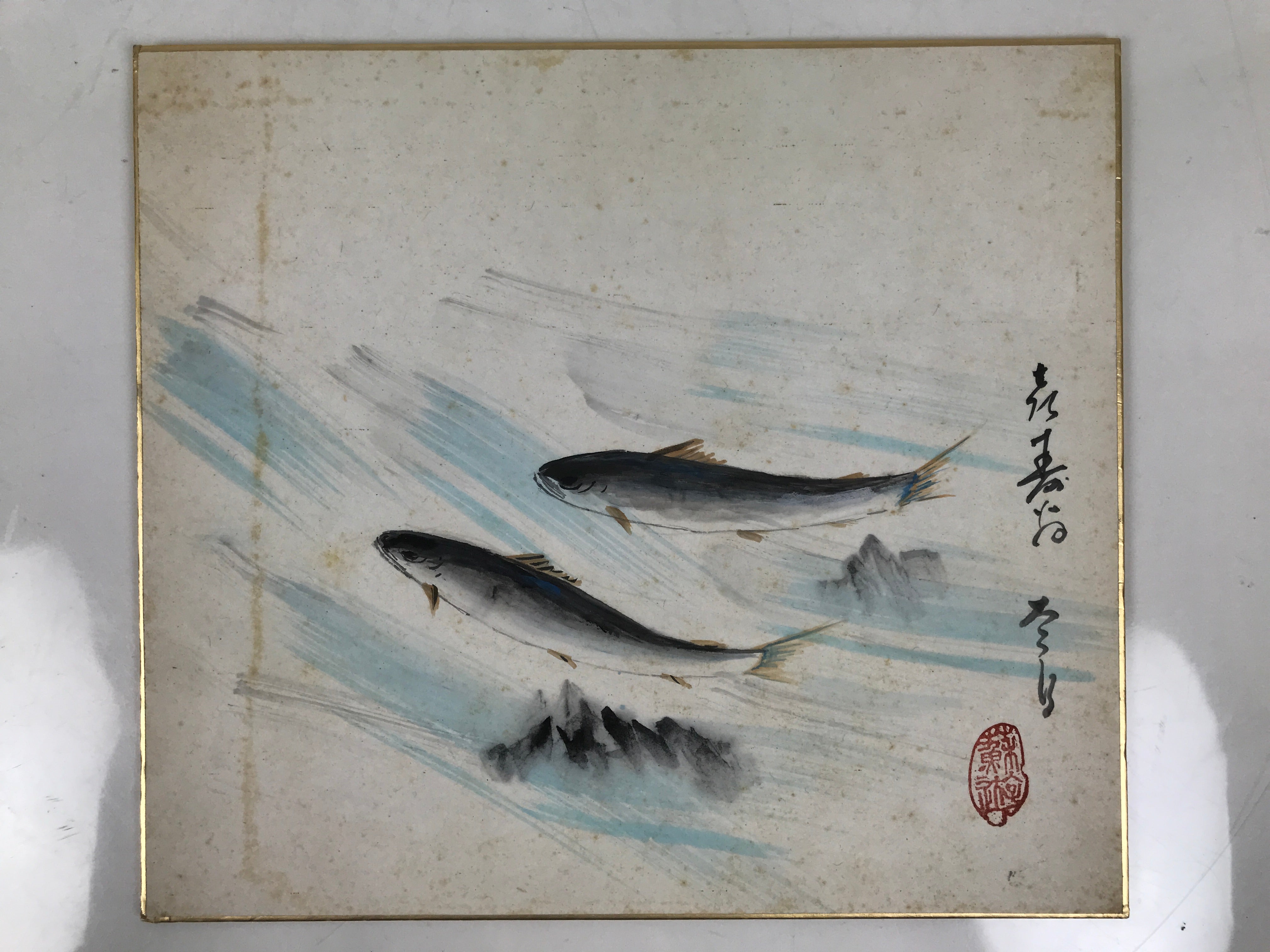This vintage Japanese shikishi art board features sweetfishies. They are going upstream in a blue river. It is hand-painted. This shikishi is signed with a red seal. There are some writings on the back.