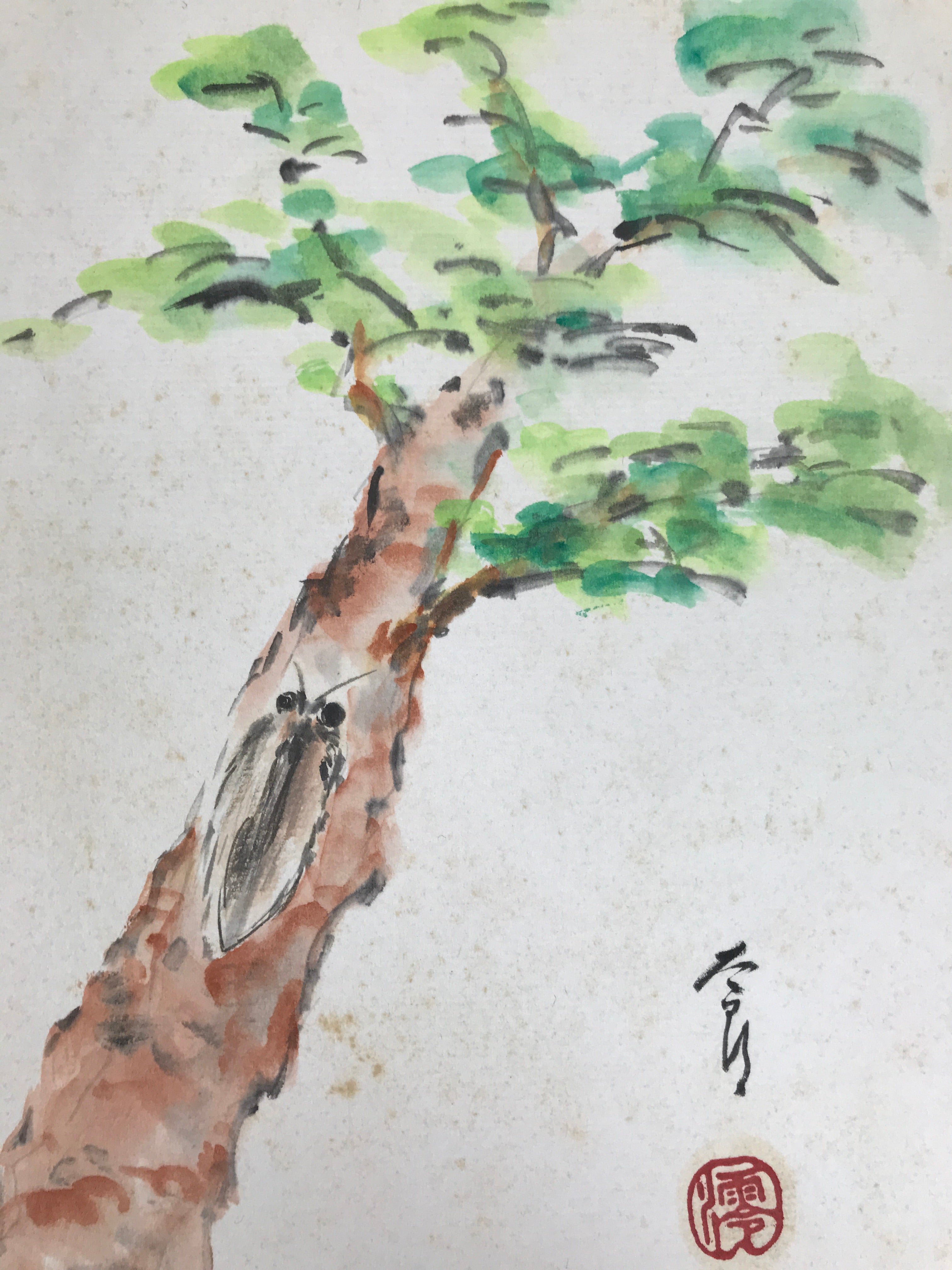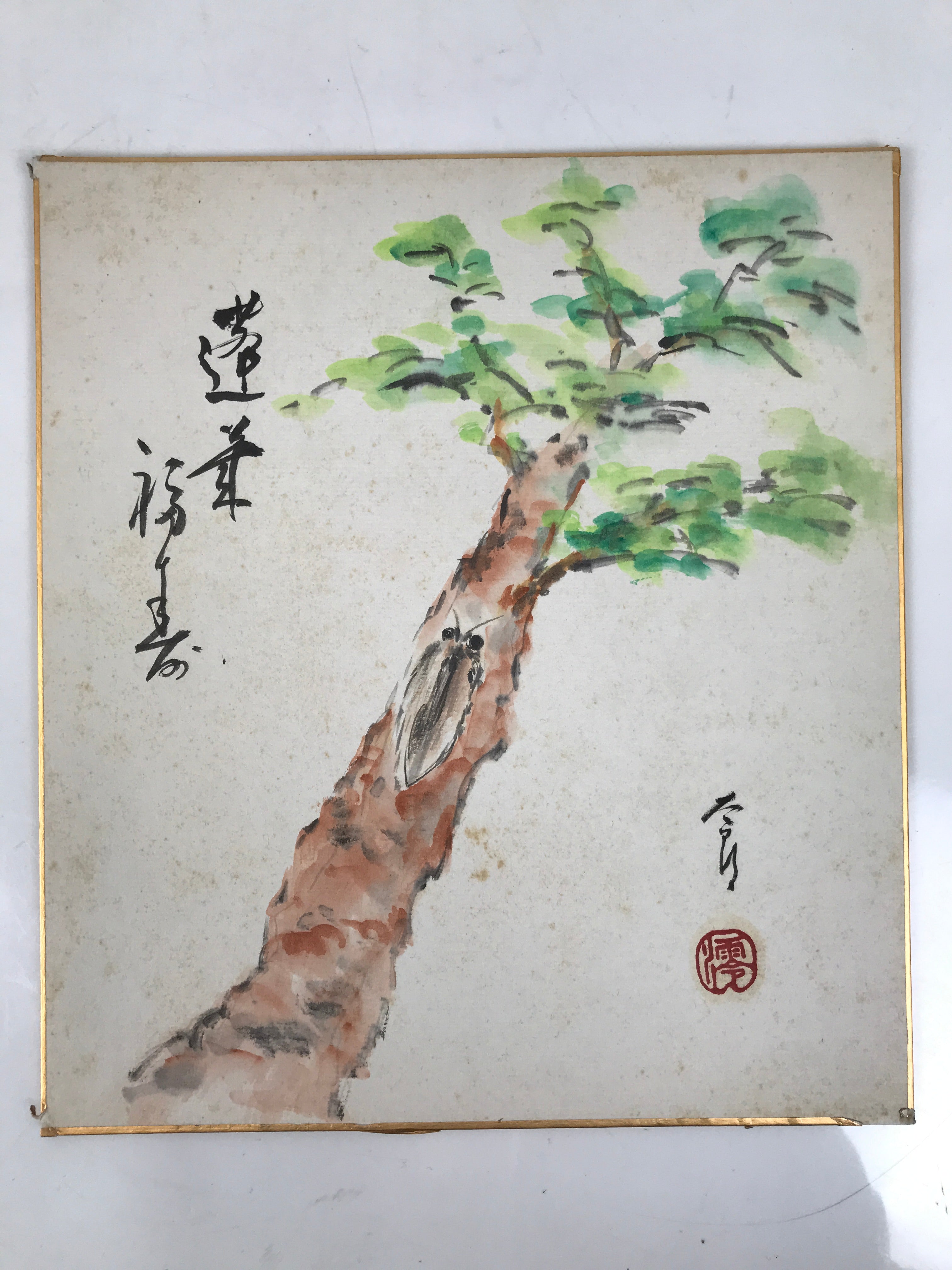 This vintage Japanese shikishi hand-painted art board represents a pine tree with a cicada. This piece is signed with names and red seals. There is some writing on the back.
