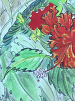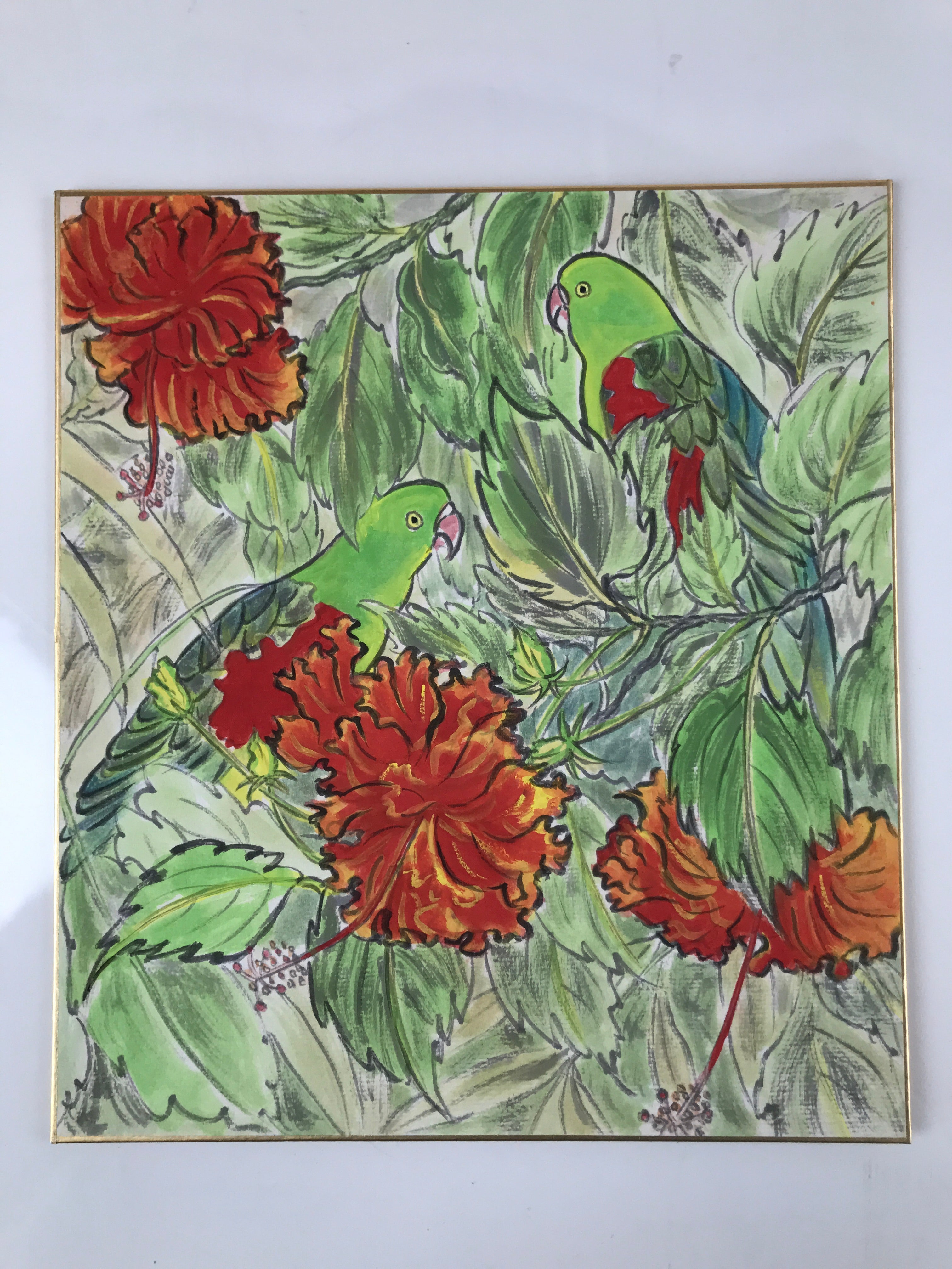Japanese Shikishi Art Board Painting Vtg Green Parakeet Parrot Red Hibiscus A655