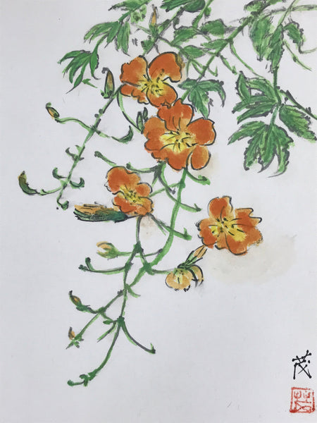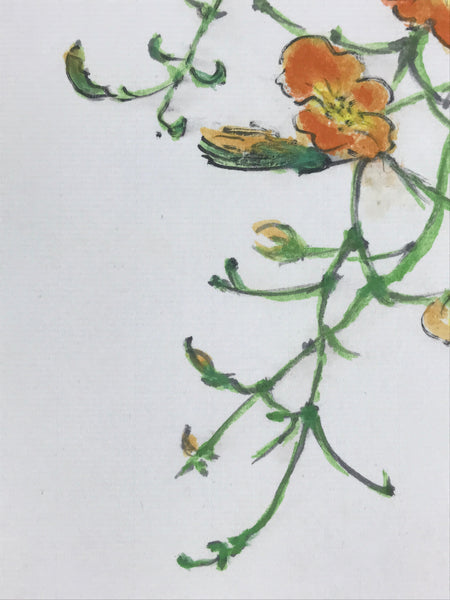 This vintage hand-painted shikishi art board of vibrant orange cosmos flowers is a stunning display piece that can find a place in any home or office decor. In Japan, cosmos are known to symbolize purity and humility. Since they bloom in autumn, the Japanese have lovingly called them akizakura, or "autumn cherry blossoms".
