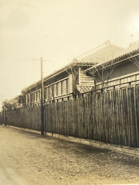 This is an original vintage early Showa Era daily life photograph of an old street and wood slat fence in front of a Japanese estate. The photo is in a classic sepia tone.
