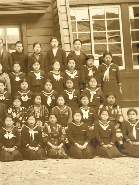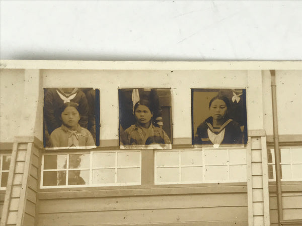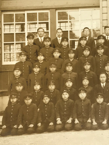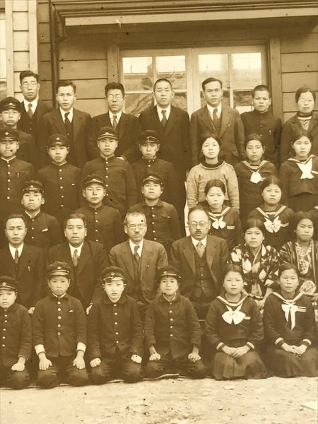 This is an original vintage early Showa Era photograph of a class of students in a soft sepia tone. The girls wear a combination of traditional sailor fuku uniforms, kimono, and plain clothes while the boys wear traditional uniforms with caps. The center and back row staff are dressed in suits. There are small squares with pictures of students who were not present on picture day.