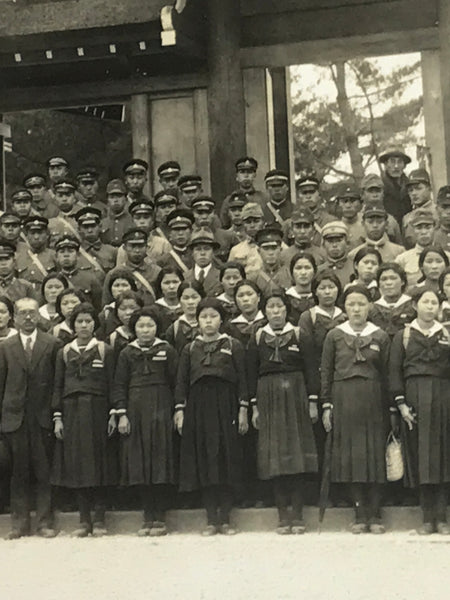 This is an original vintage early Showa Era photograph of a class of students in a sepia tone. The boys wear military uniforms (they were likely expected to enslist and were also given military education), while the girls wear traditional sailor-fuku school uniforms. The teachers all wear suits. They pose in front of a temple or palace gate.