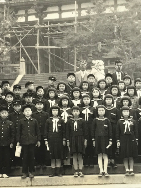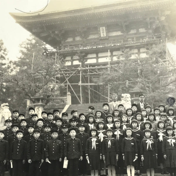 This is an original vintage Showa Era photograph of a class of junior high school students on a school trip to Kyoto posing in front of the Kiyomizu Temple gate with their teachers. The boys all wear the traditional black jacket uniforms with caps, while the girls wear black and white sailor-fuku uniforms.