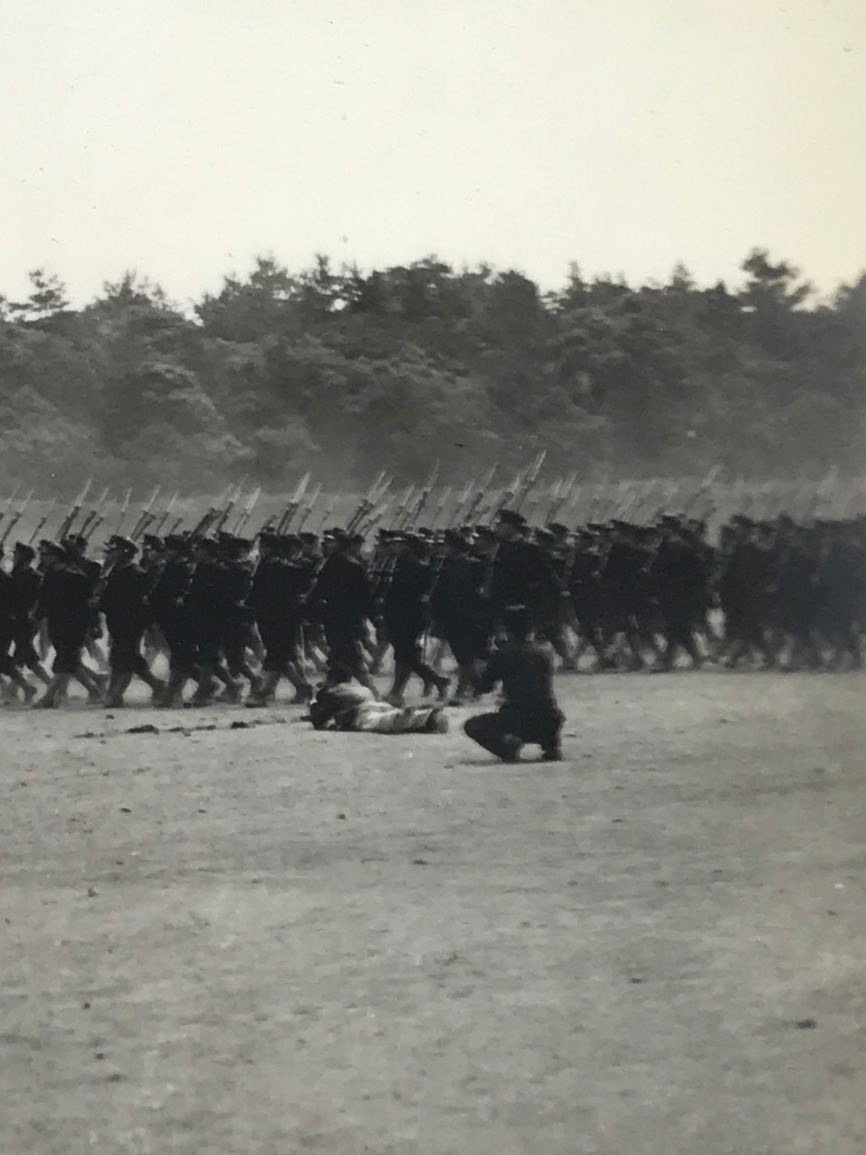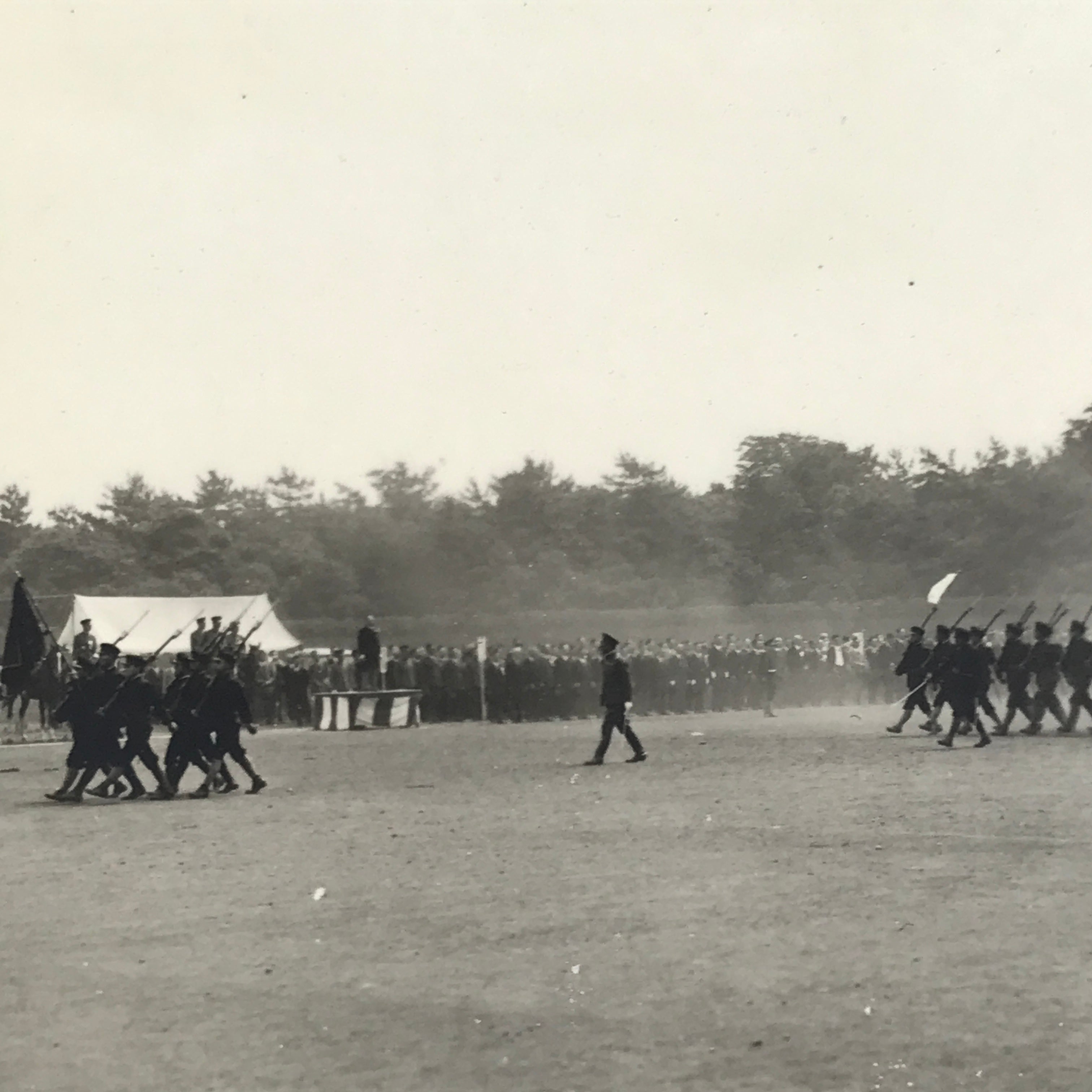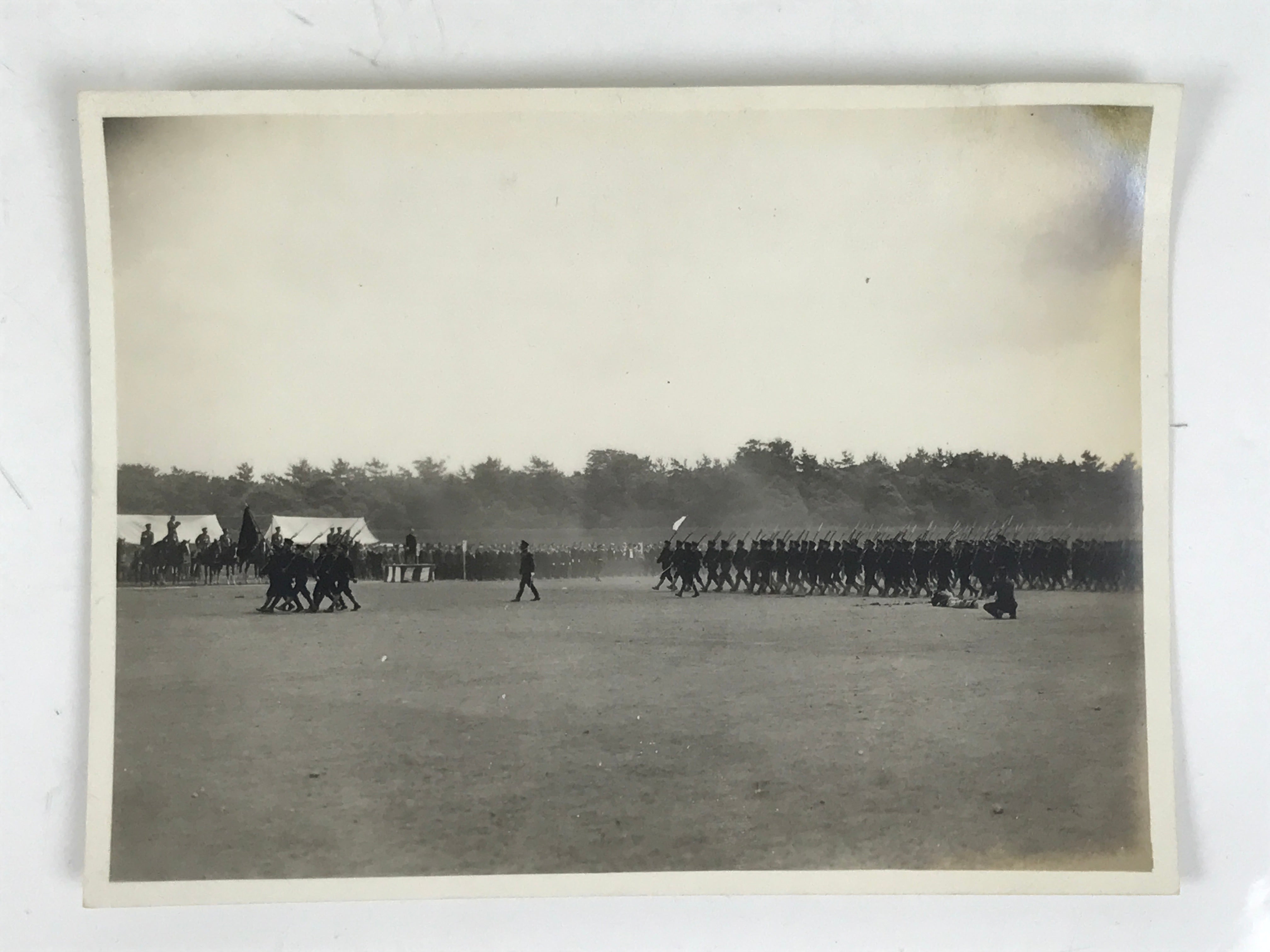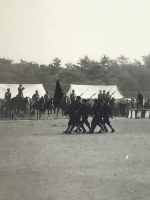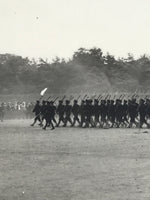This is an original vintage Showa WWII black and white photograph of a military demonstration. There are marching soldiers in formation in their uniforms holding rifles with bayonets. Ranking officers are seen seated on horses on the left side while spectators wearing suits are seen standing at the back.