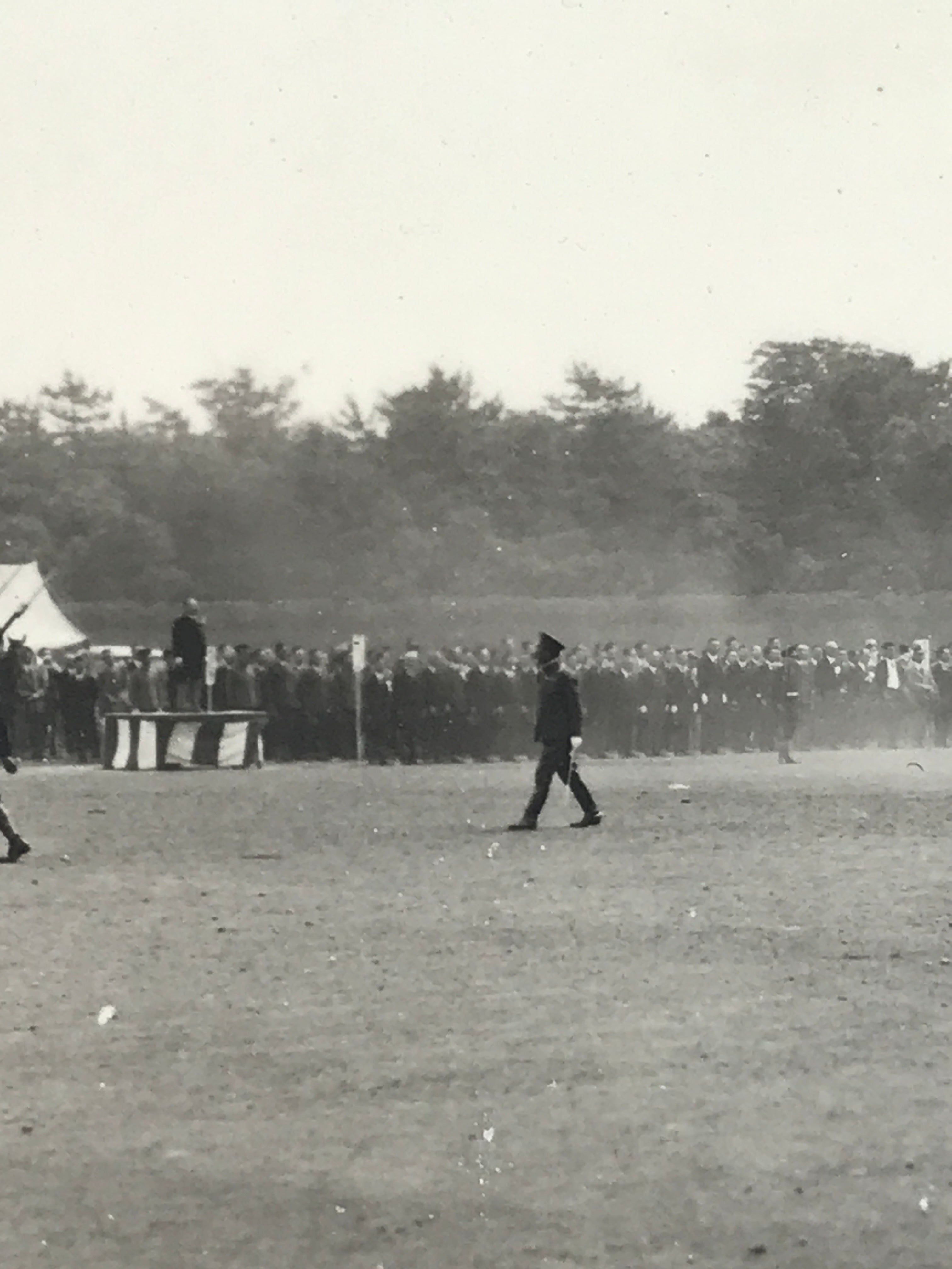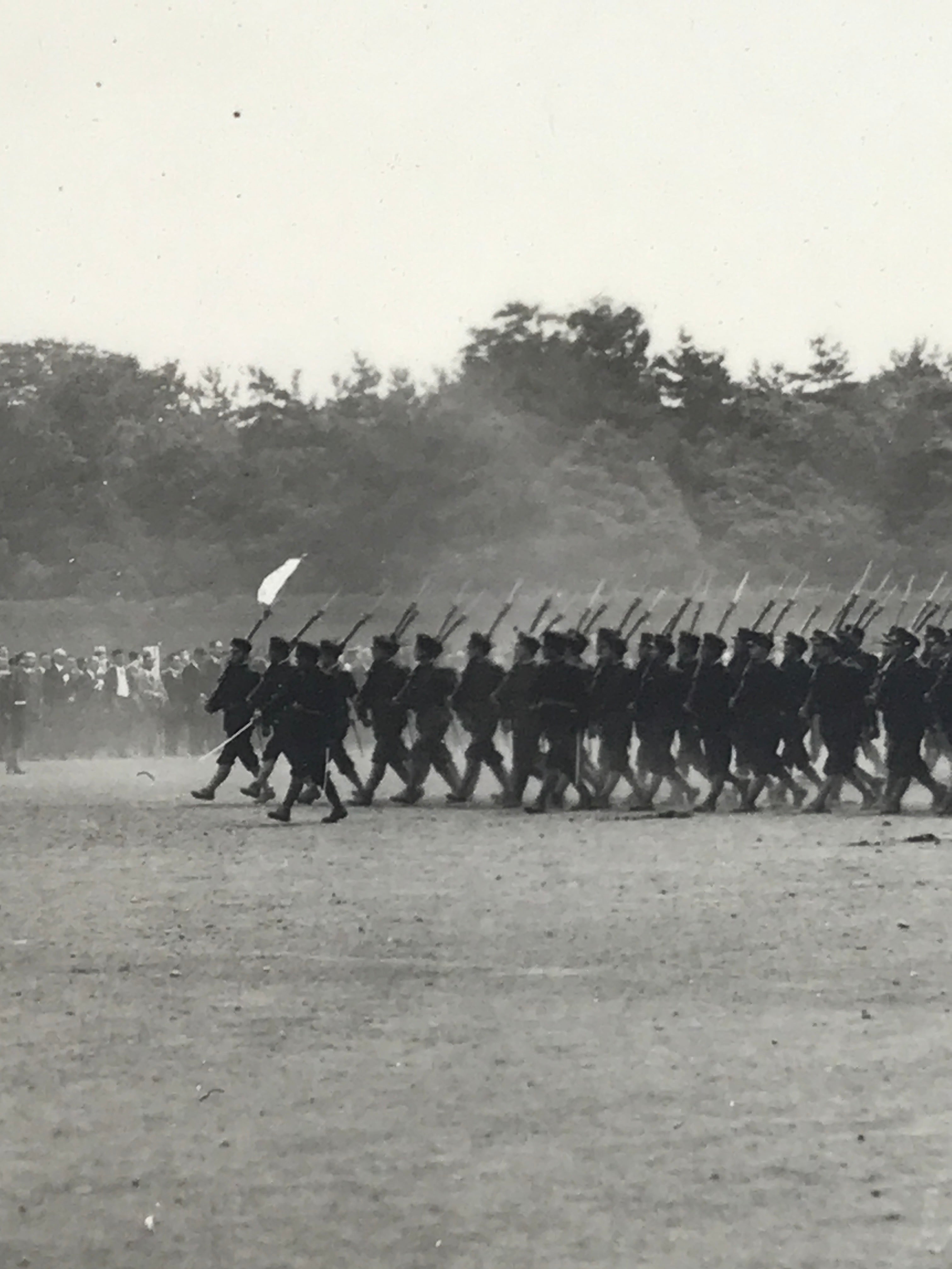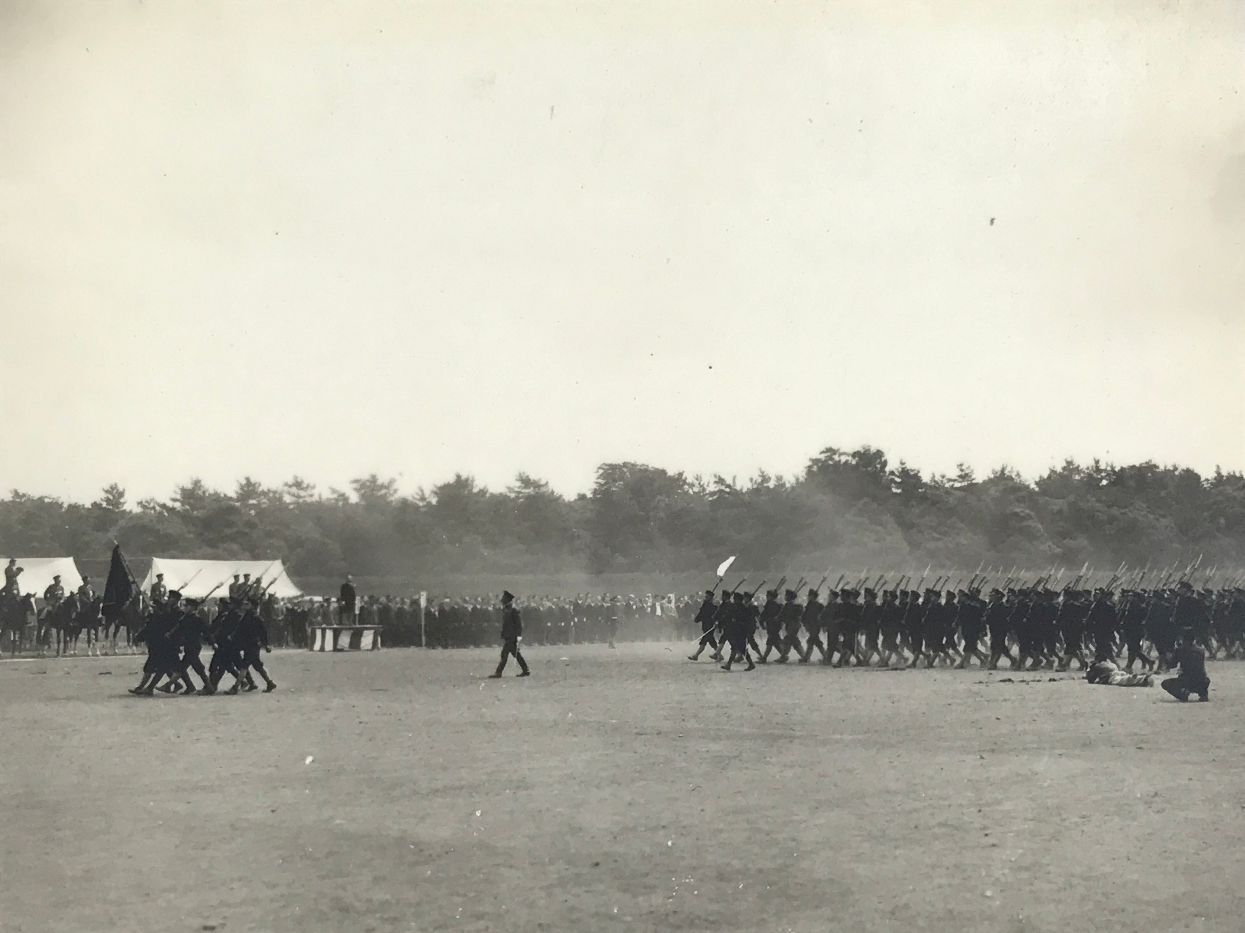 This is an original vintage Showa WWII black and white photograph of a military demonstration. There are marching soldiers in formation in their uniforms holding rifles with bayonets. Ranking officers are seen seated on horses on the left side while spectators wearing suits are seen standing at the back.
