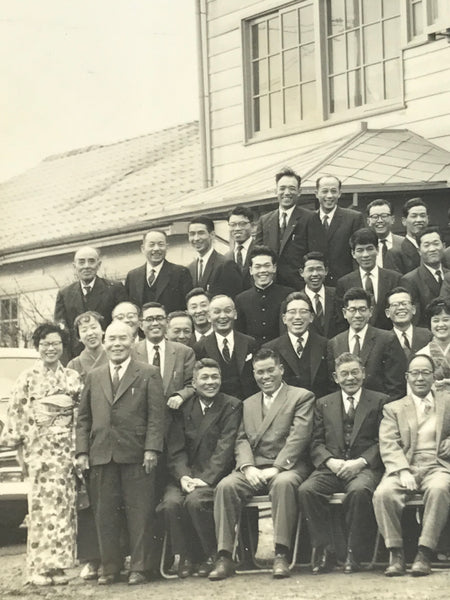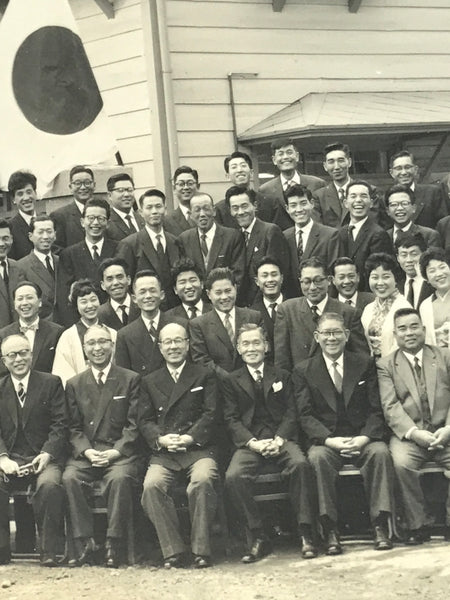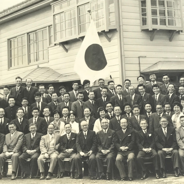 This is an original vintage Showa Era portrait photograph of a group of staff from the Nagoya plywood factory branch of Yuasa Trading Company in front of their office building. All the men wear suits while all the women wear kimono.