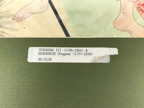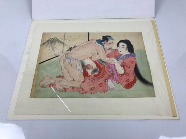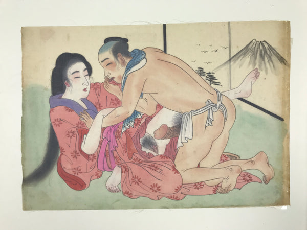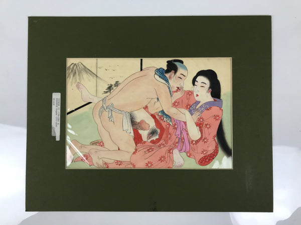 This is a Japanese erotic shunga handpainted piece, likely a reproduction, by Toyokuni III and Hiroshige Utagawa. It depicts a woman with a naked man. It is painted on silk, and afterwards placed inside a thick paper frame with a protective plastic sheet.