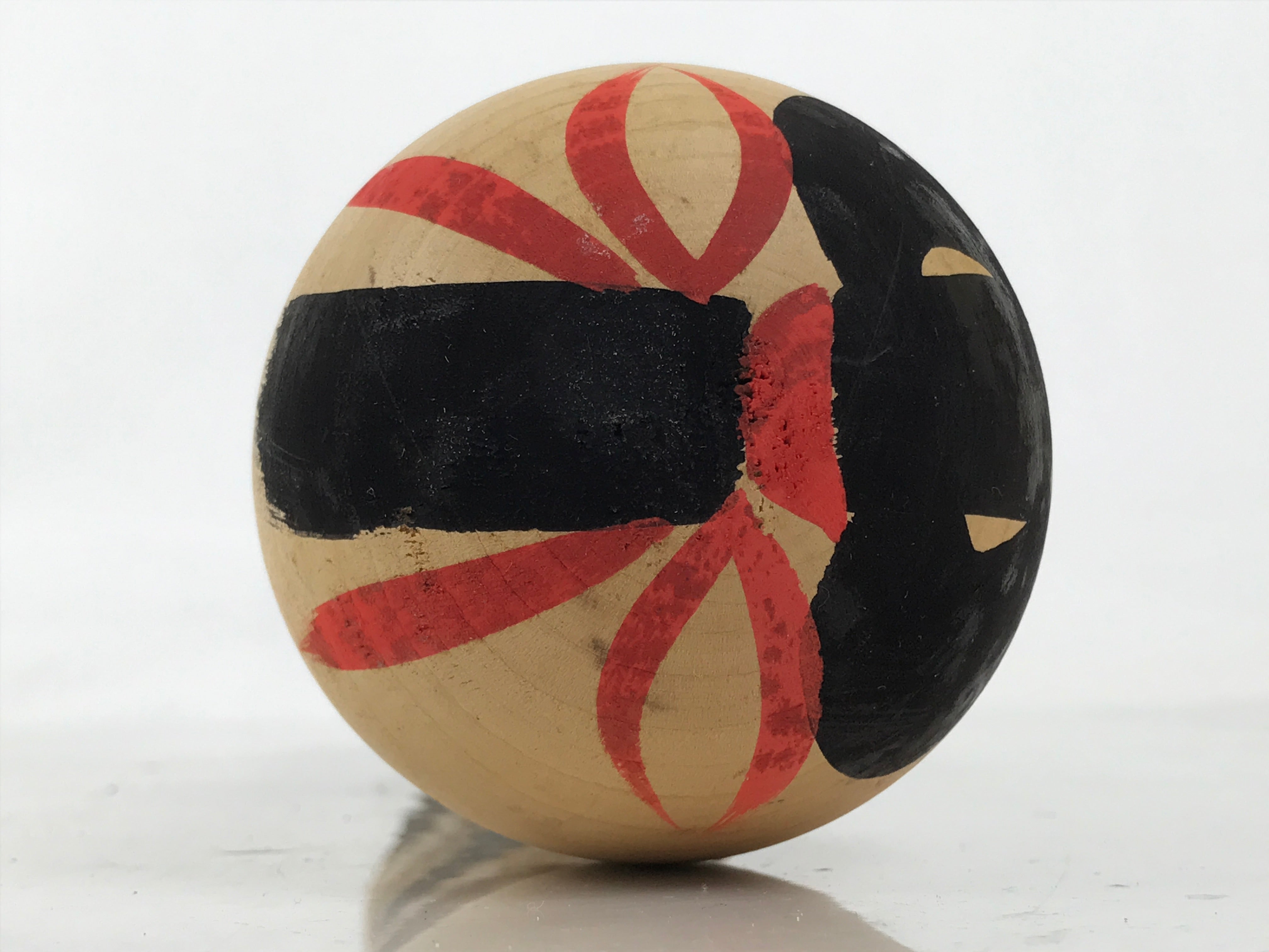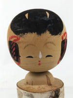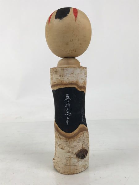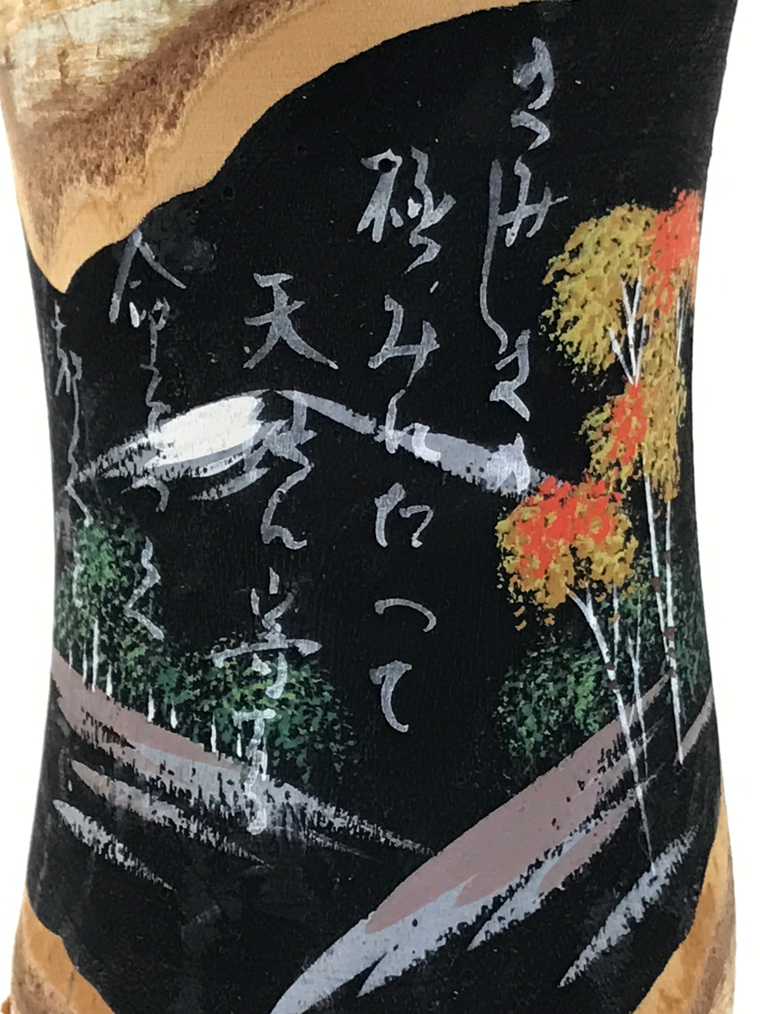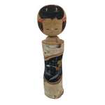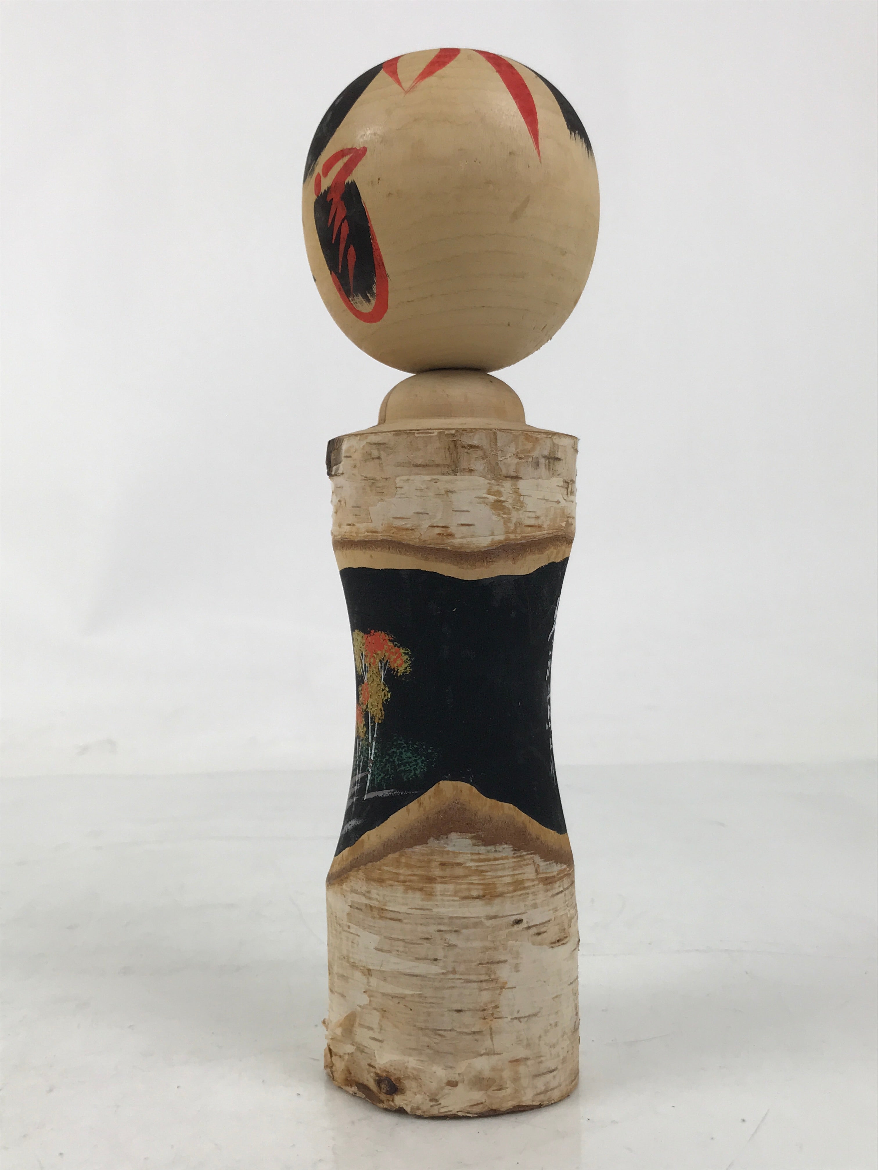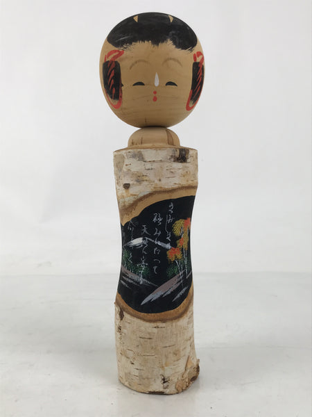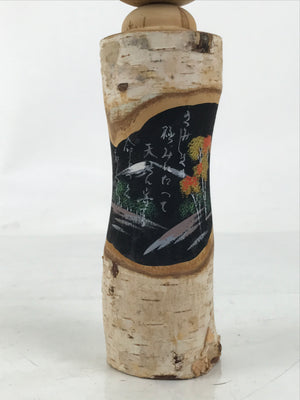 This vintage Japanese wooden doll has a simple, classic design. The body is made of birch looking wood and is painted with fall landscape featuring a mountain and orange leaves, and a calligraphy of a poem. The face style is young with a playful expression and the hair features hair attached at the back with a red ribbon or string.