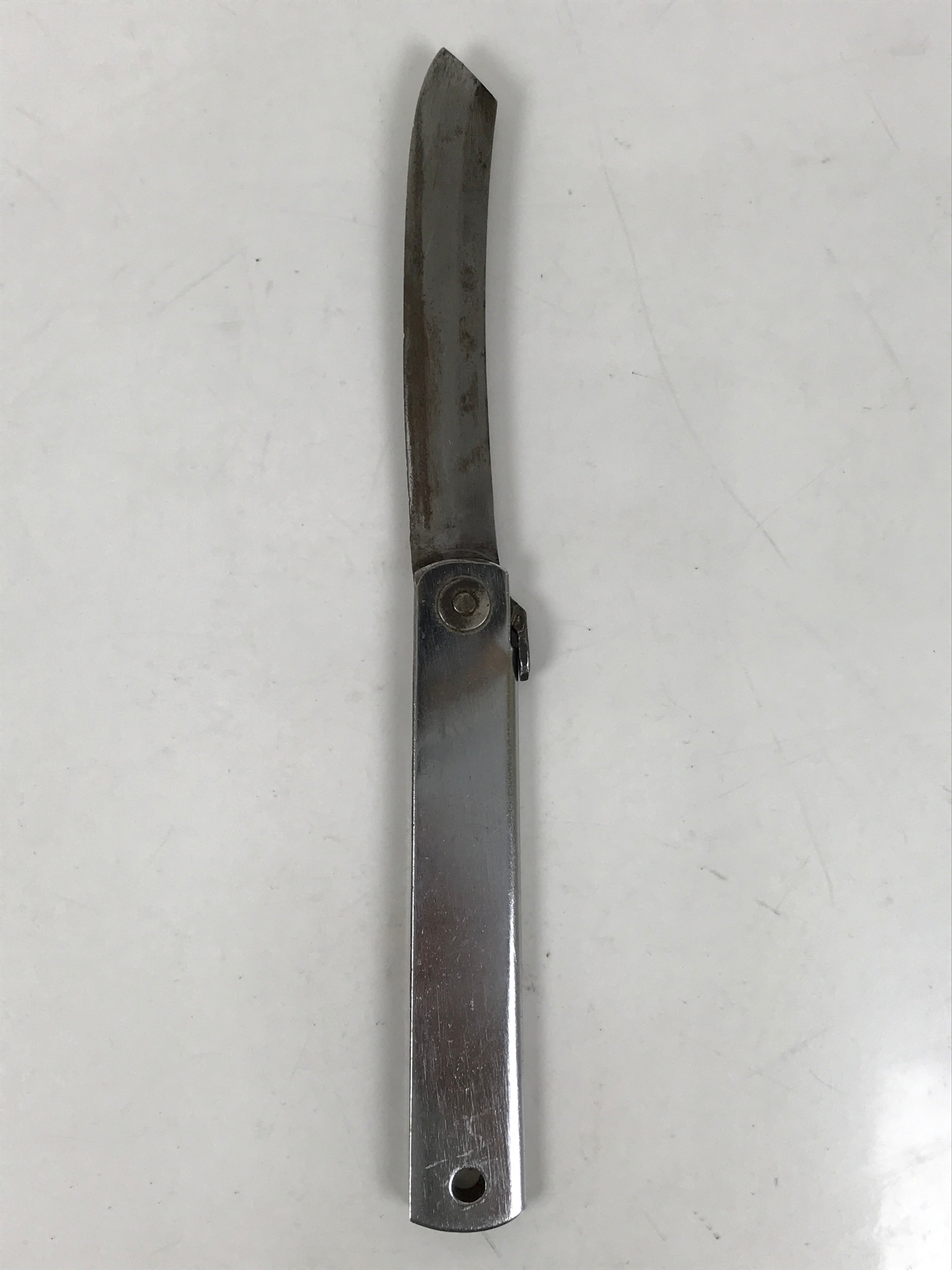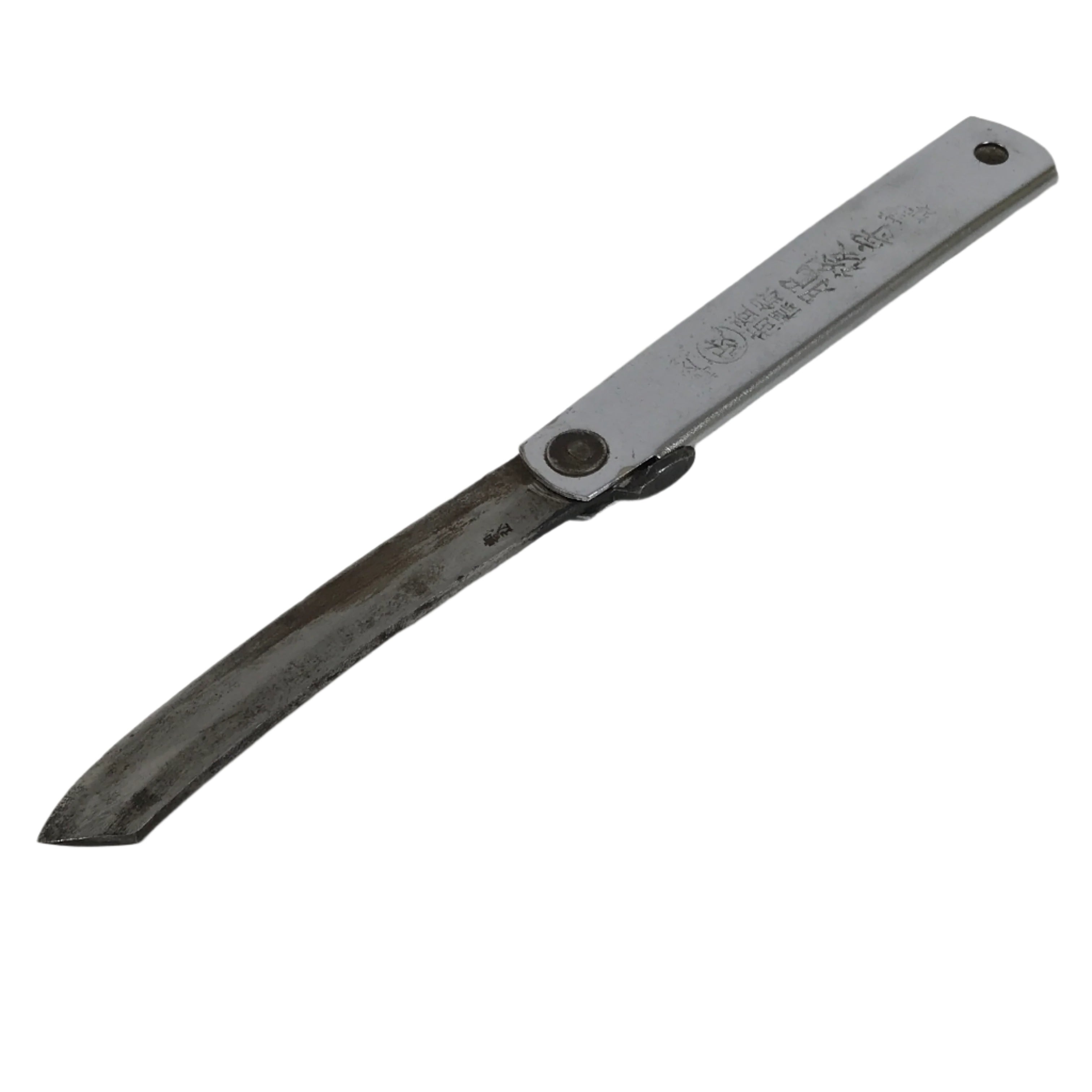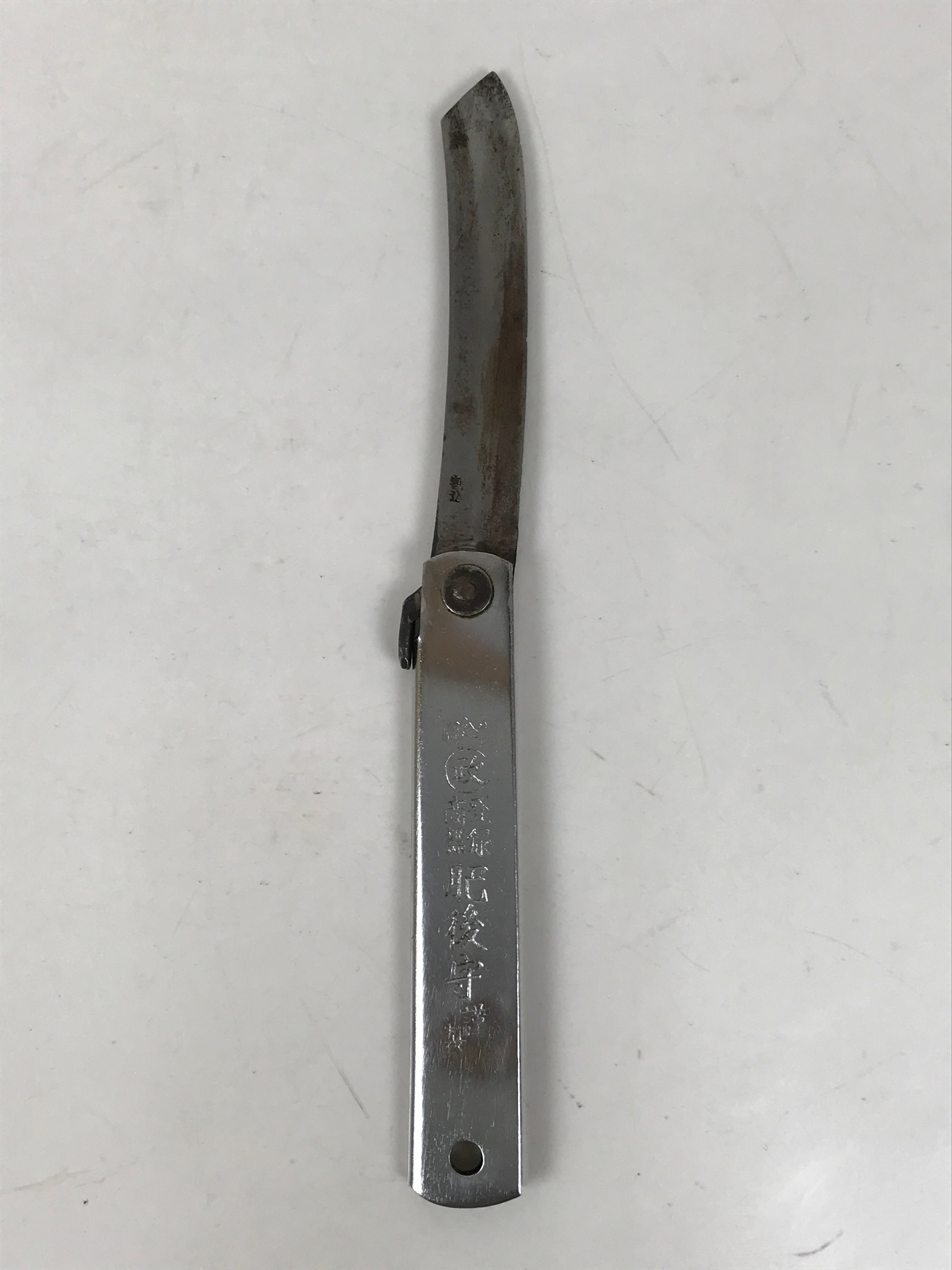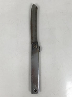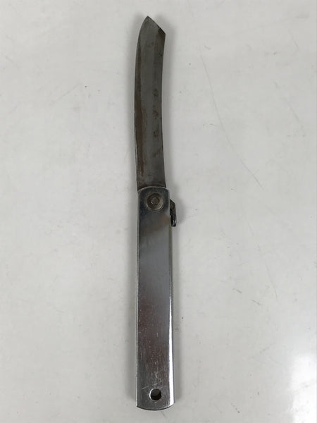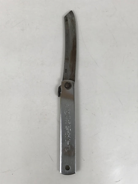 This is a vintage Japanese foldable knife. It has a steel blade and a metal handle that can hold the blade when folded. The knife is double-edged and has some inscriptions on the handle and the blade. This foldable knife is good for woodworking, outdoor activities, leisure, and bamboo crafts.