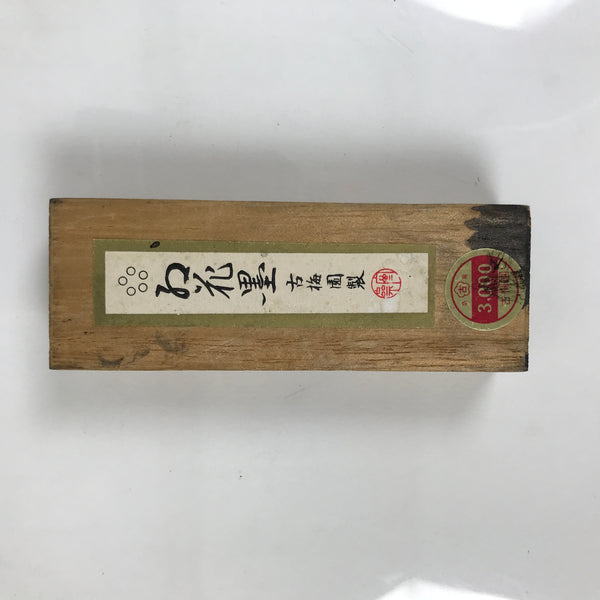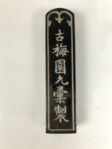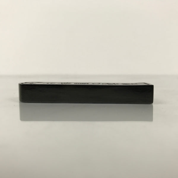 This is a Japanese vintage ink stick for calligraphy. It is black and has white inscriptions on the front and blue ones on the back. To make ink, grind it with some drops of water on an suzuri-type ink stone. It comes with the original wooden storage case.