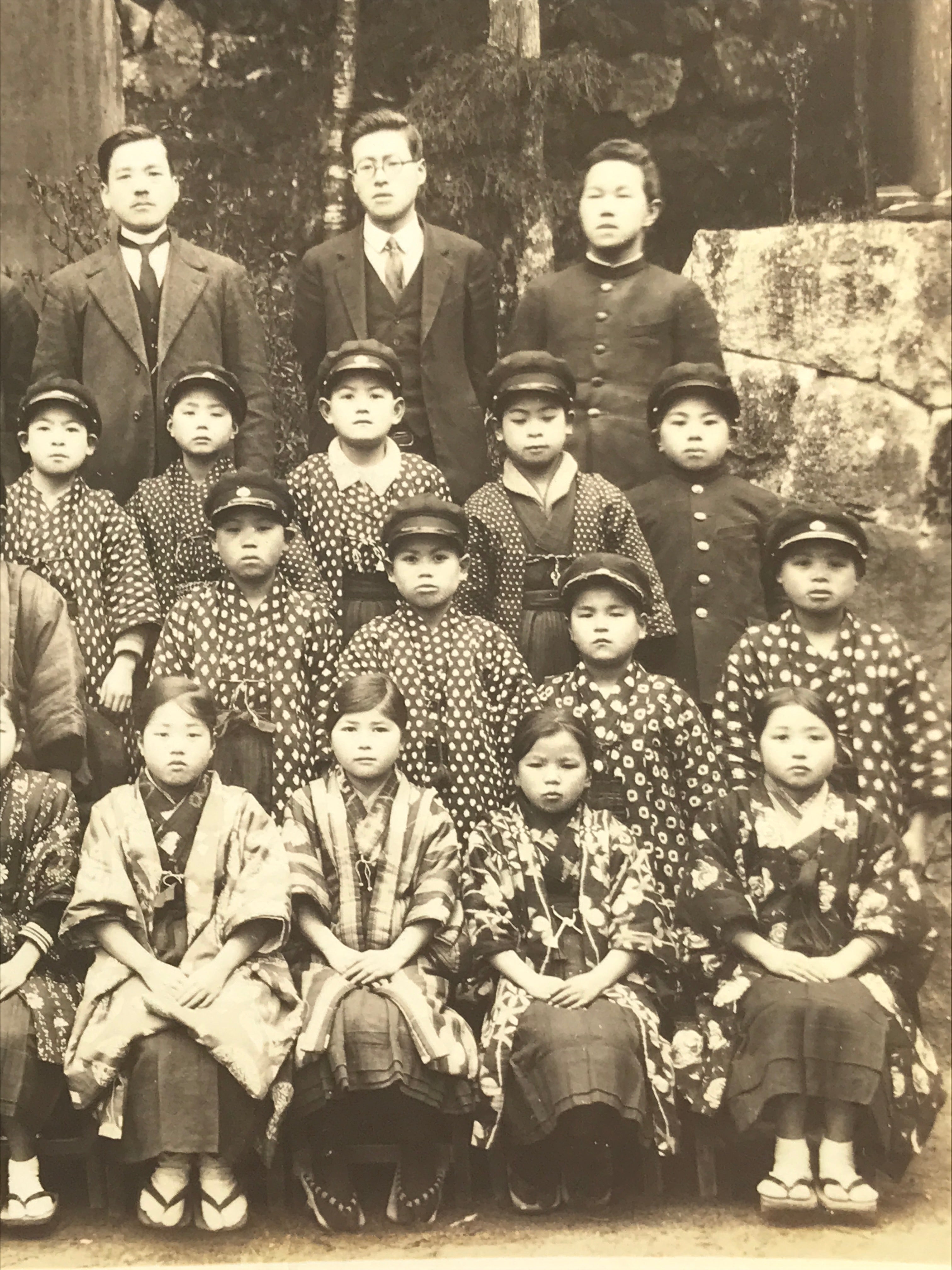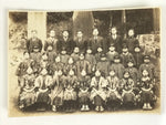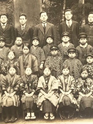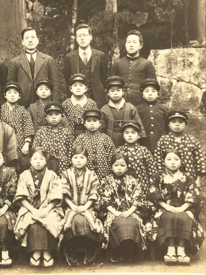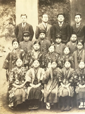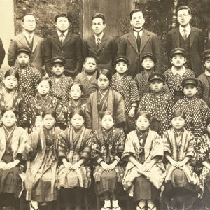 This is an original antique Taisho Era photograph of a class of students with their teachers in front of the schoolhouse. Both boys and girls wear hakama uniforms with the boys wearing caps. The teachers at the back wear suits.