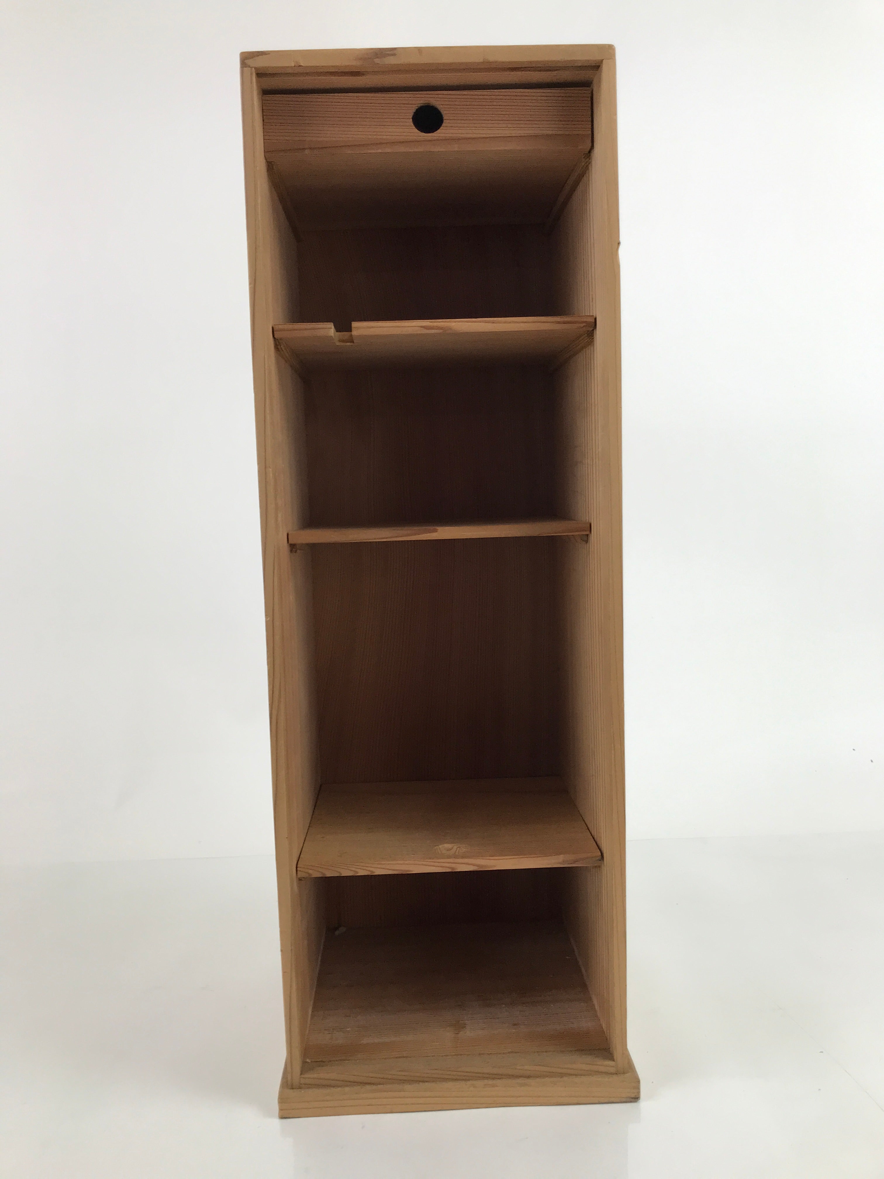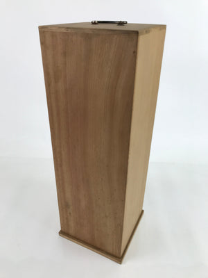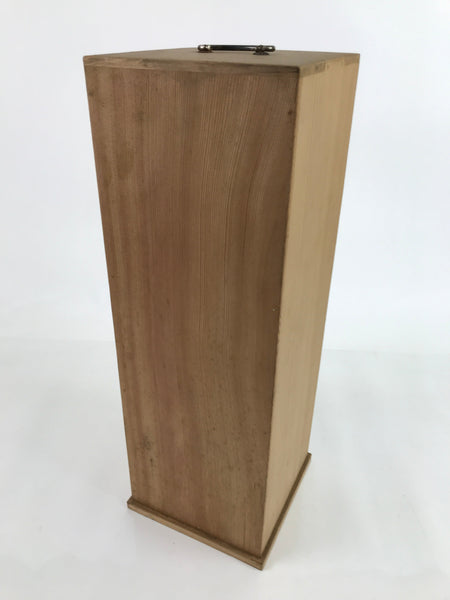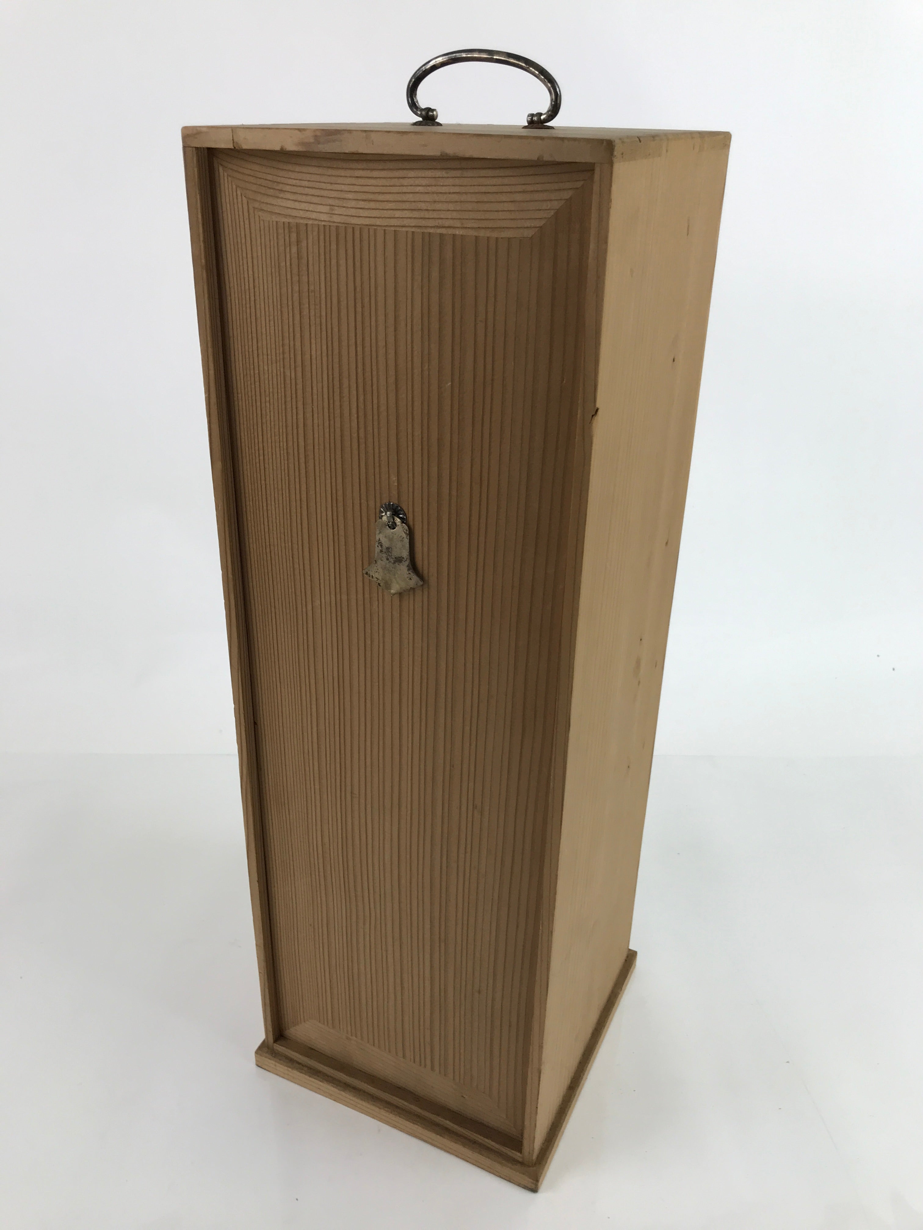This vintage Japanese tea ceremony set Chabako is a wooden box used for carrying a set of tea ceremony utensils. It contains a set of basic tea utensils such as a green tea bowls and tea whisk. This box has a small drawer on top that holds miscellaneous items essential to tea ceremony. The front panel opens thanks to a hanging metal handle shaped as a lucky charm. The metal handle on the top panel makes it easy to carry around.