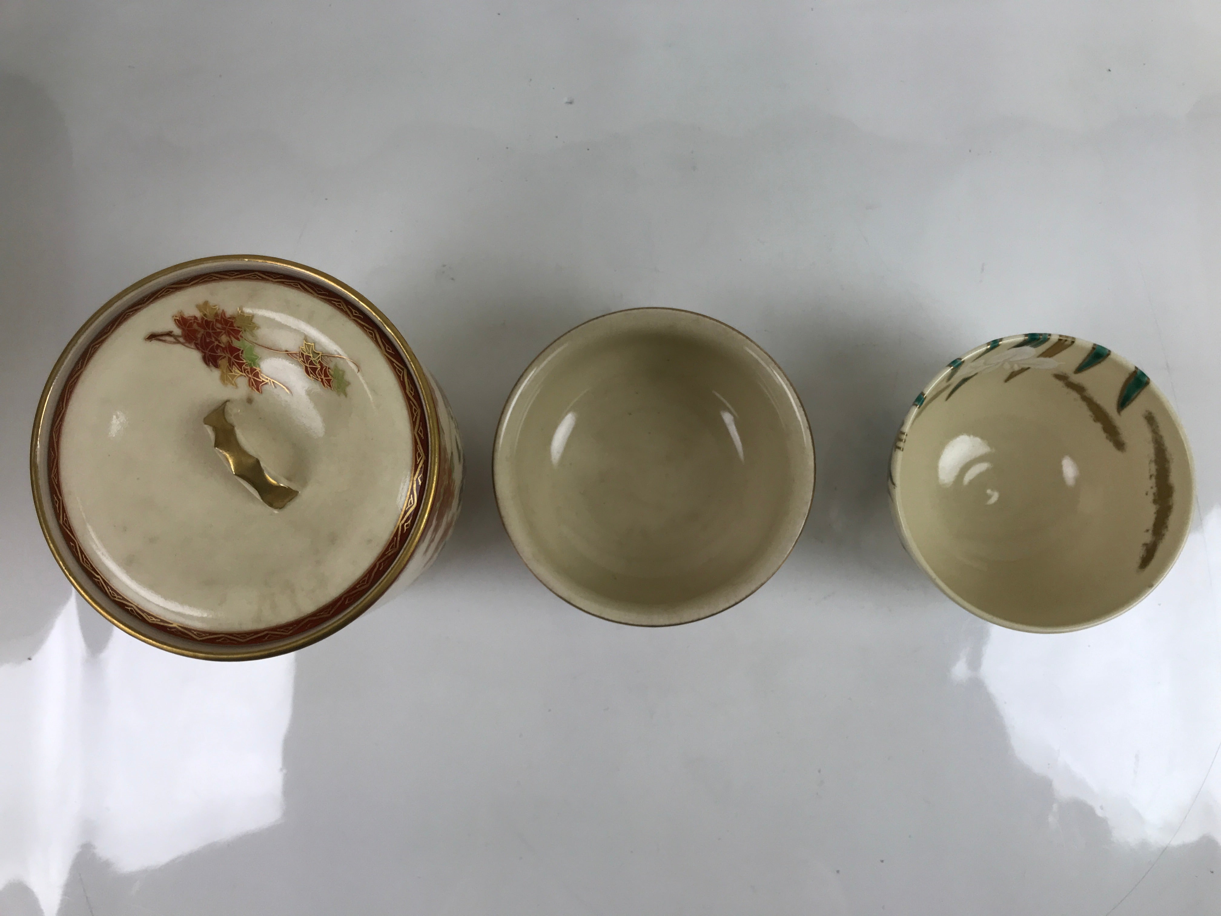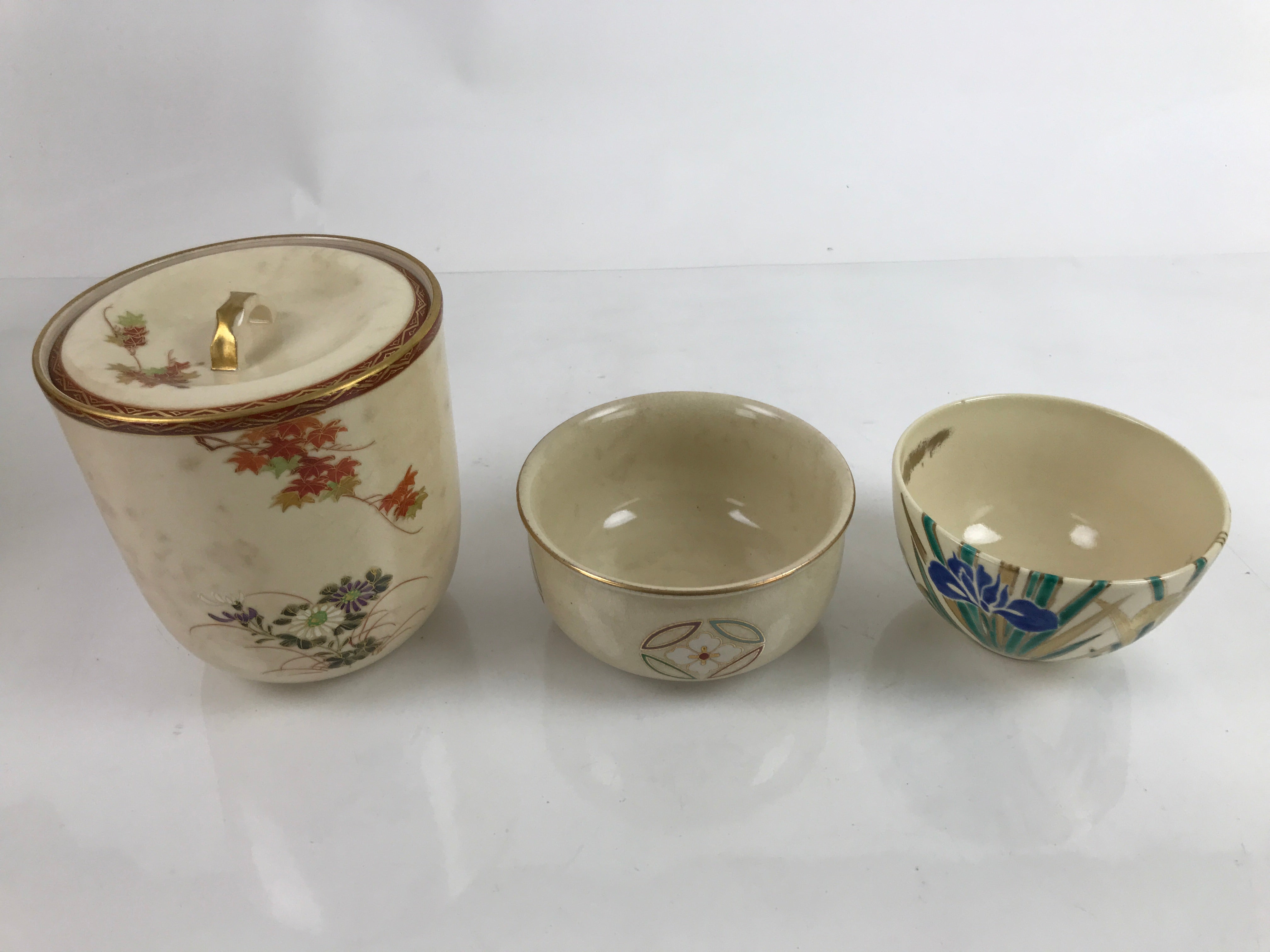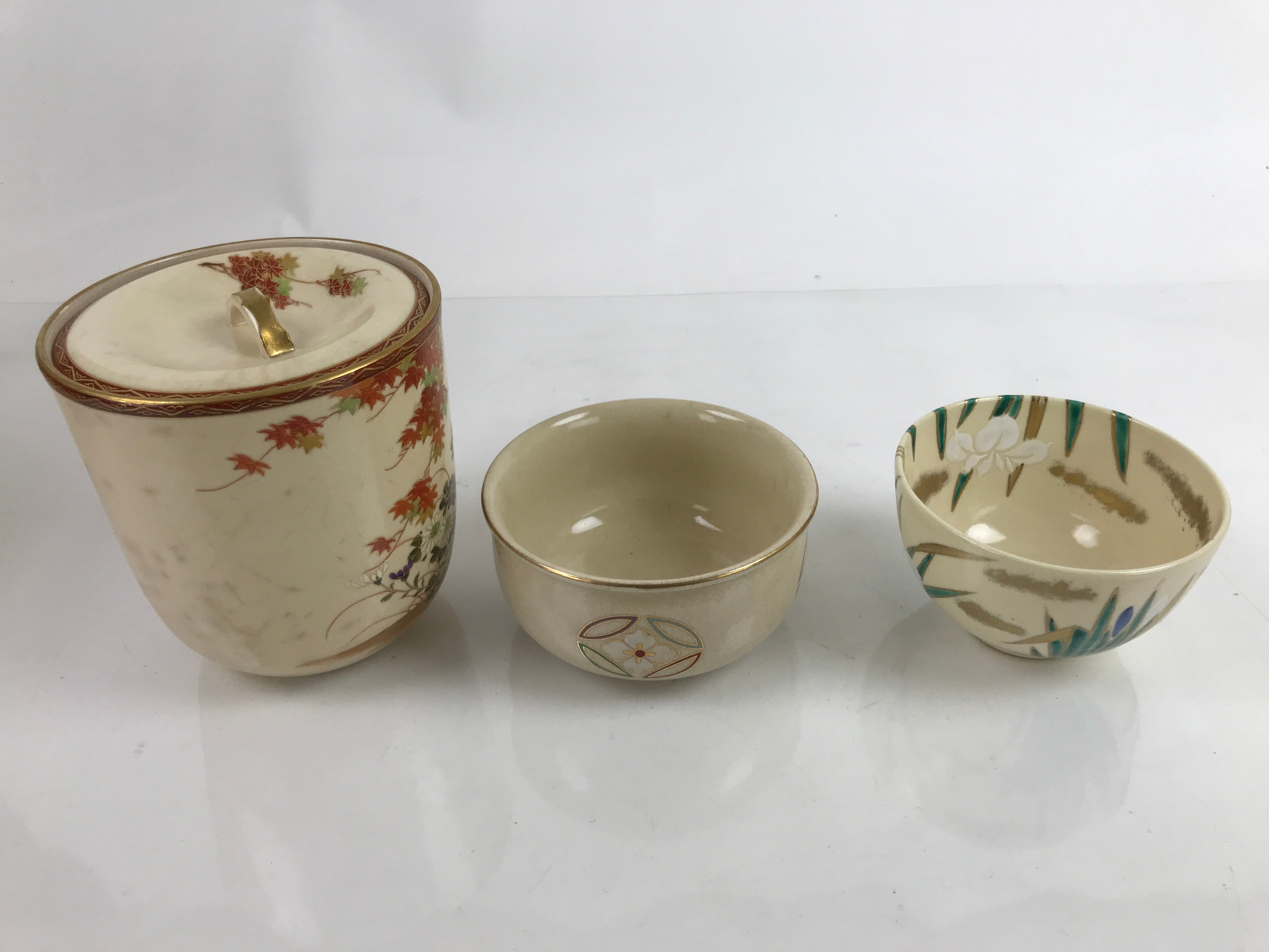 • Water jug: Kyo ware. Pale yellow crackle glaze with colorful flowers and momiji leaves with gold foil on front. Matching lid.