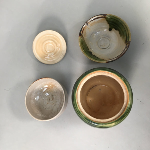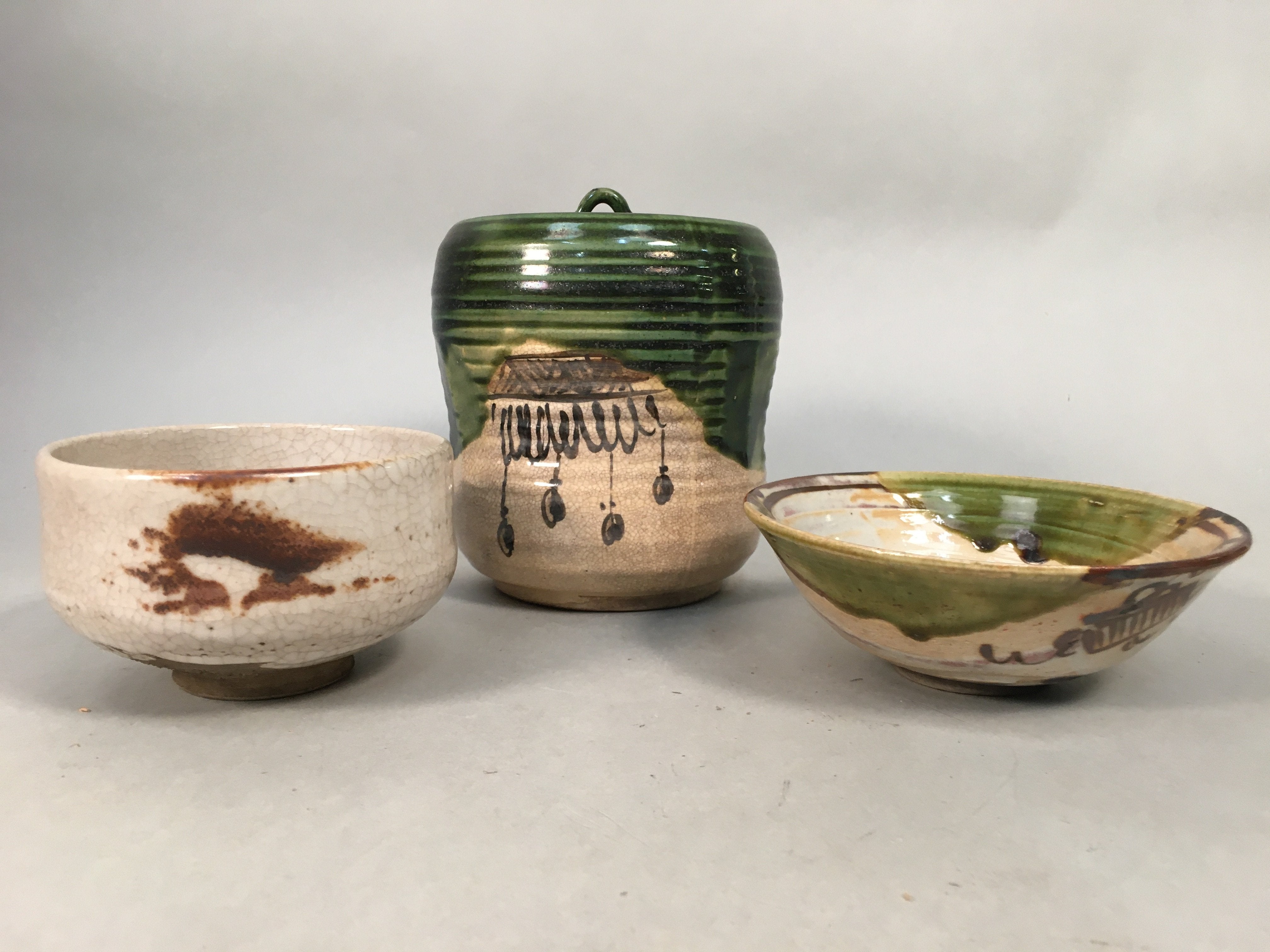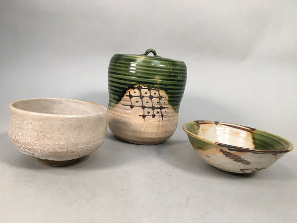 • Oribe ware water pot, ladle stand, and shallow bowl