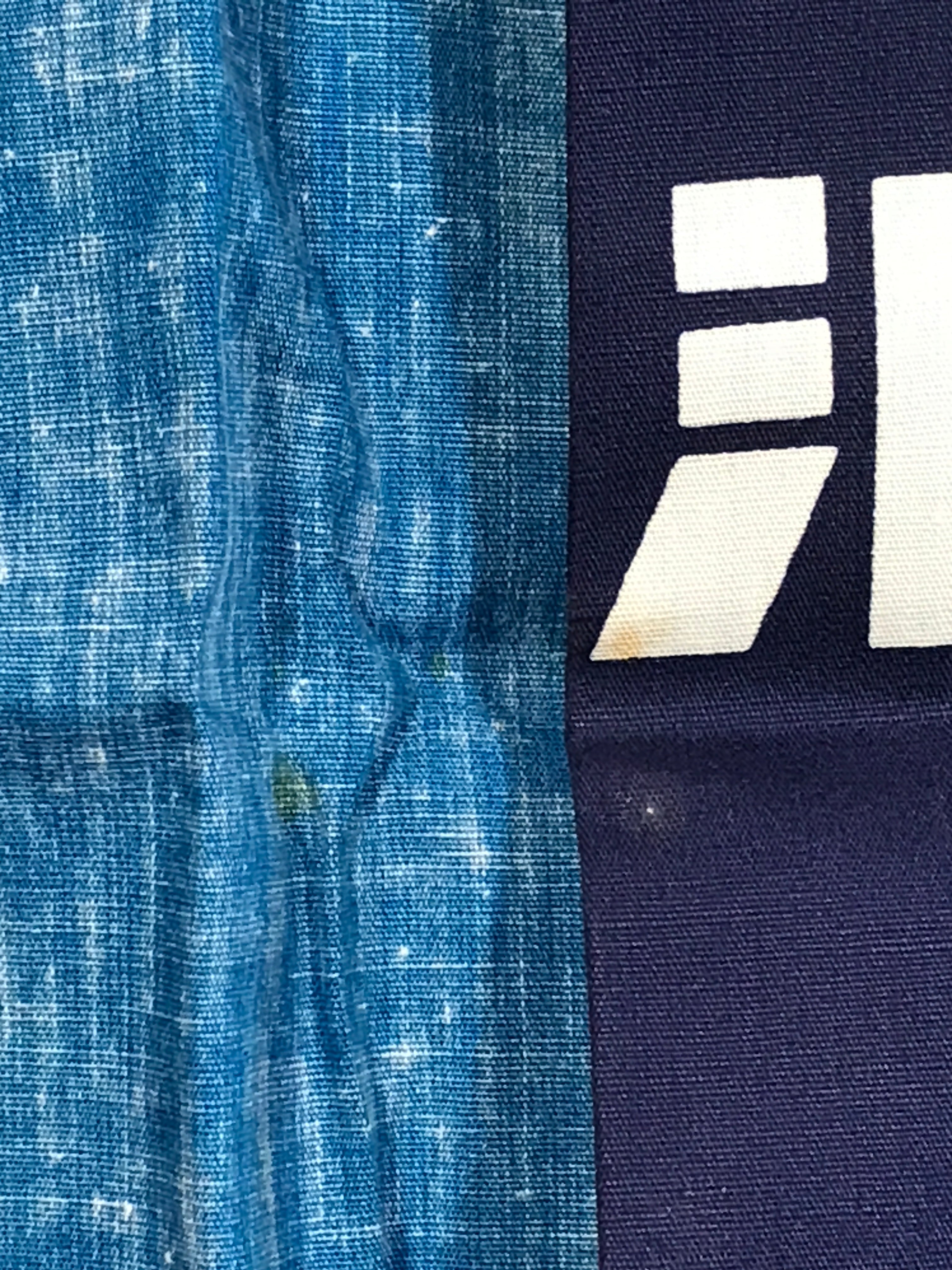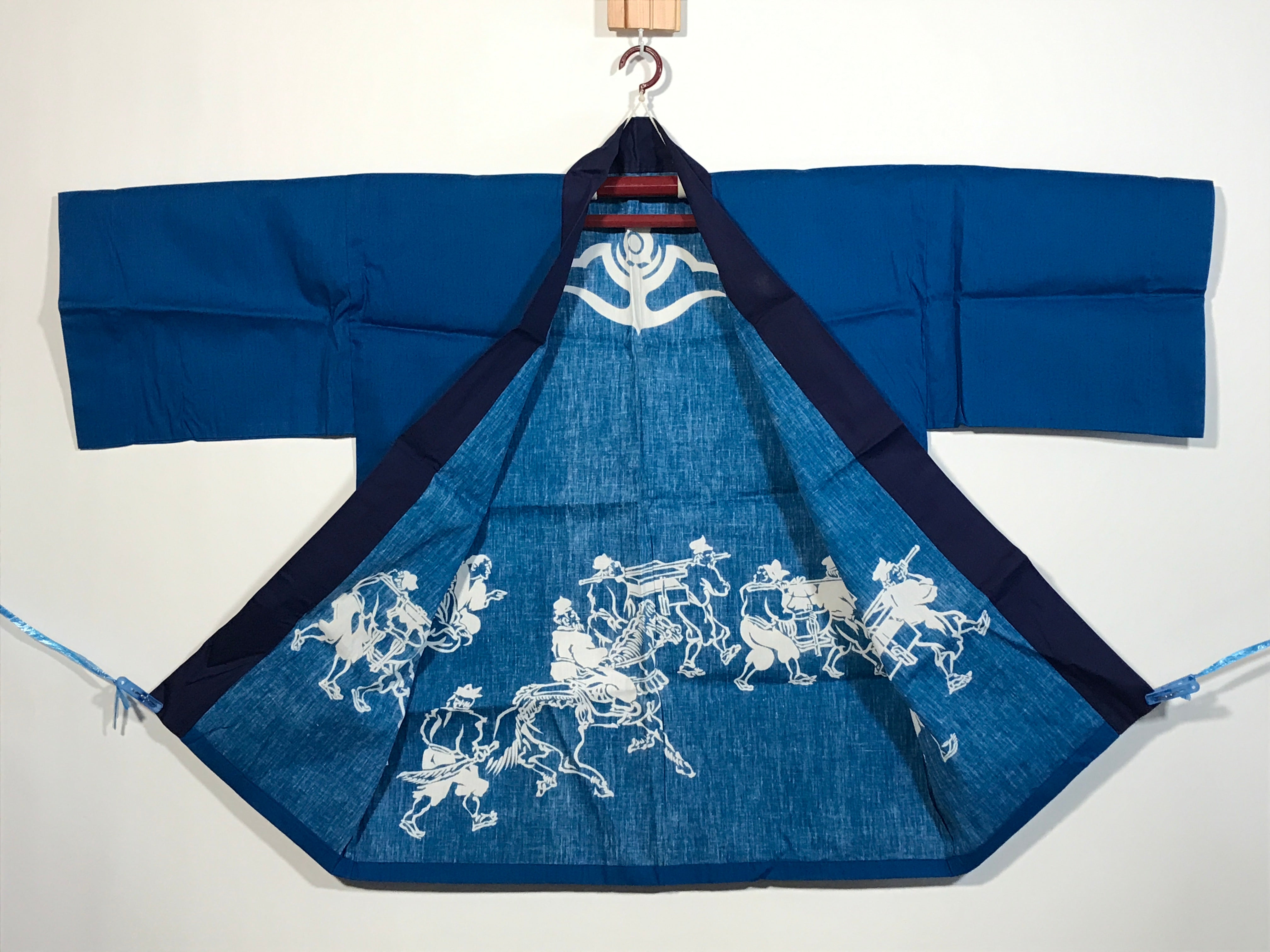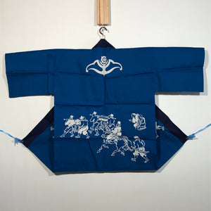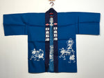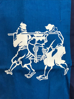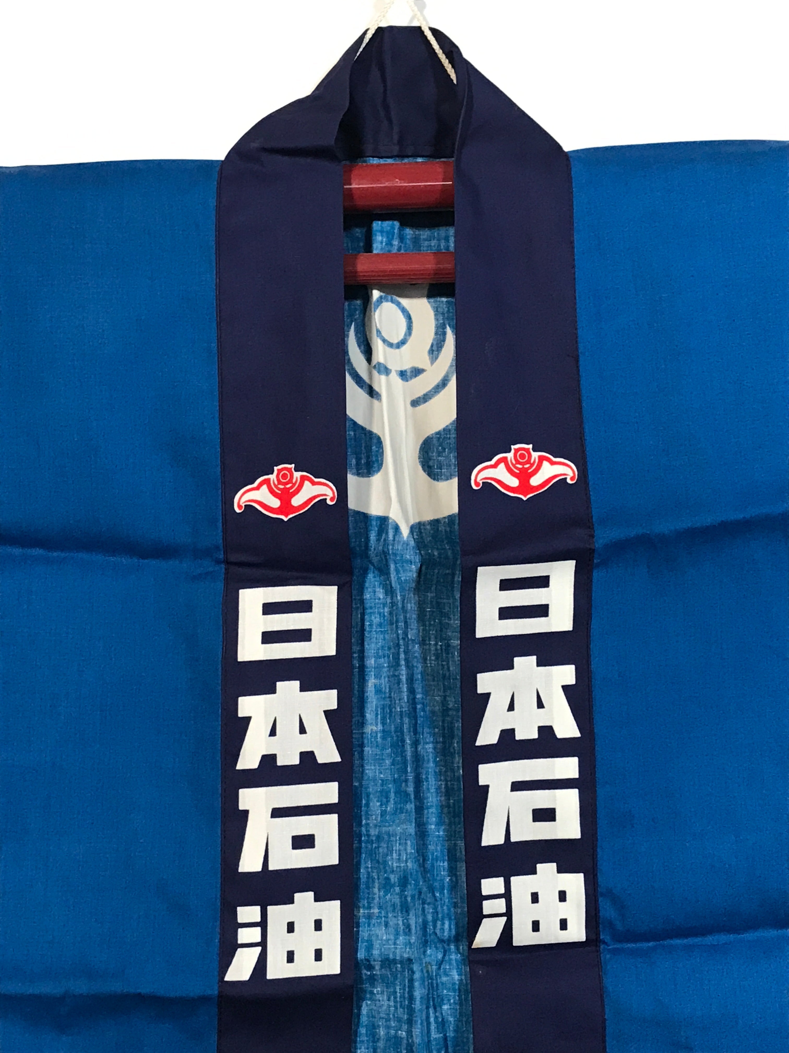This is a vintage Japanese traditional festival clothes Happi. It is written as Nippon Oil in Kanji. Perhaps it was used at a gas station event or something. A blue Happi with a picture of a person carrying stuff.