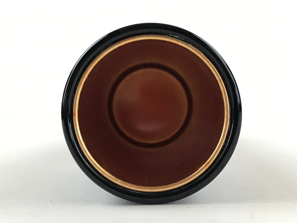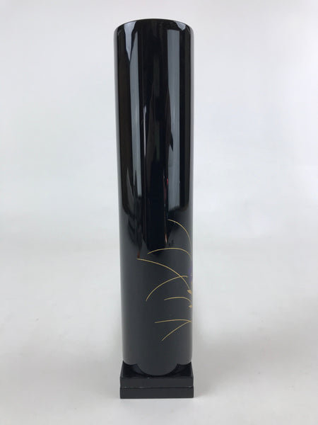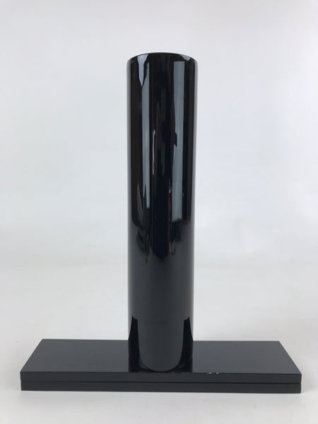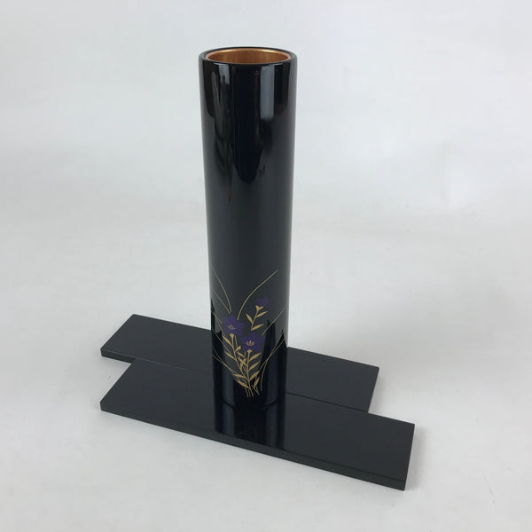 This is a Japanese vintage flower vase, Kabin. This tall tube vase has a glossy black finish and is decorated with a picture of purple flowers, likely bellflowers or Kikyo in Japanese, on the front. It has a copper casing on the inside. This vase comes with two rectangular pieces that can be used as a vase base and arranged as desired. This elegant vase and its base can be easily stored in the paper box when not on display. It can be used for Ikebana flower arrangement.