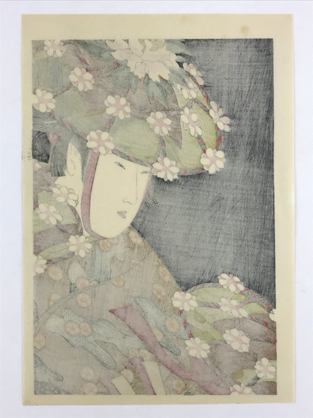 This is one of the 30 selections of vintage Utamaro Ukiyo-e woodblock printing published by Yuyudo. The title of the print is "当世踊子揃 鷲娘"  dancing woman. Kitagawa Utamaro was a Japanese artist. He is one of the most highly regarded designers of ukiyo-e woodblock prints and paintings and is best known for his "Bijin ōkubi-e, large-headed pictures of beautiful women" of the 1790s. He also produced illustrated books on insects.
