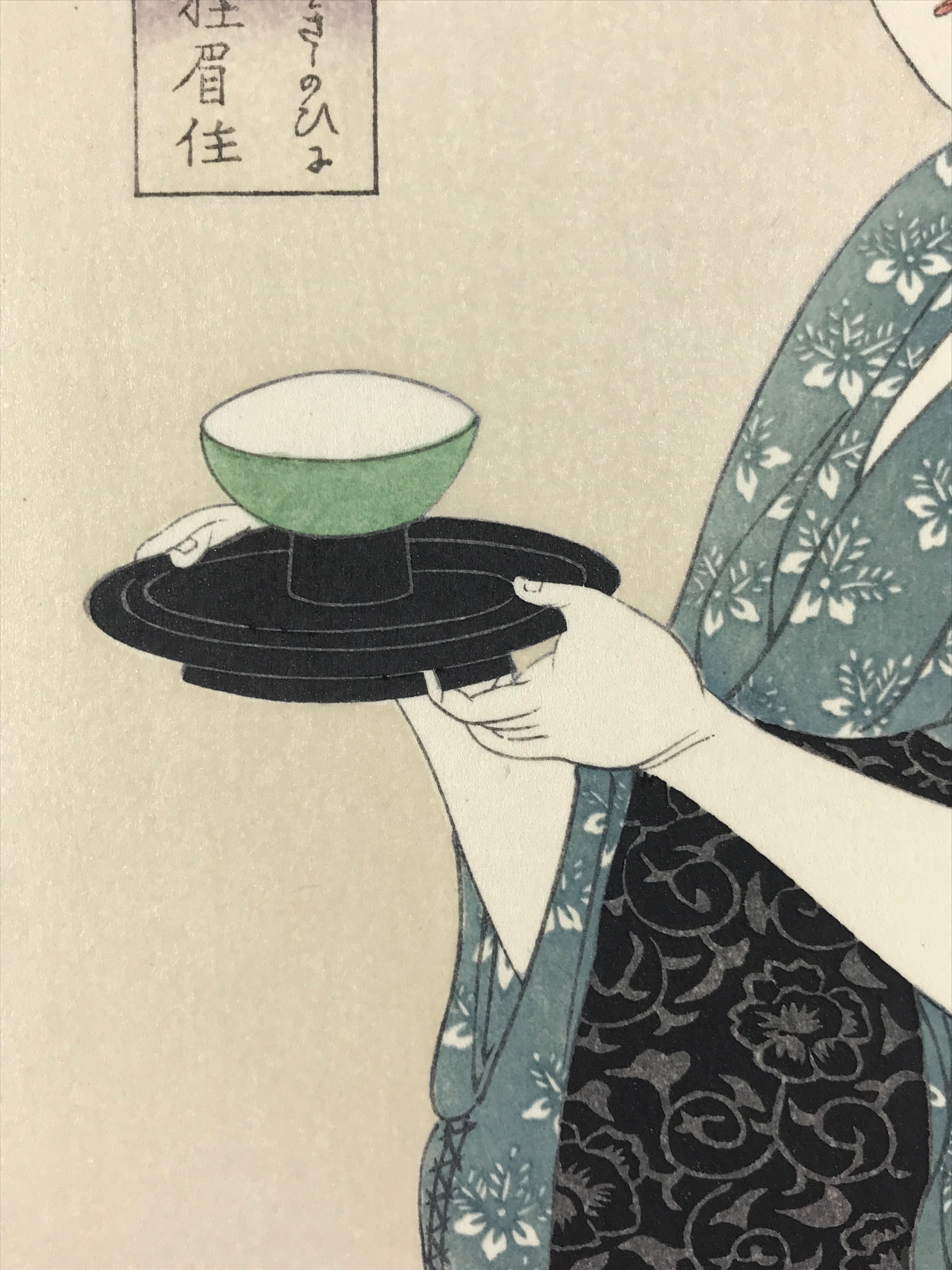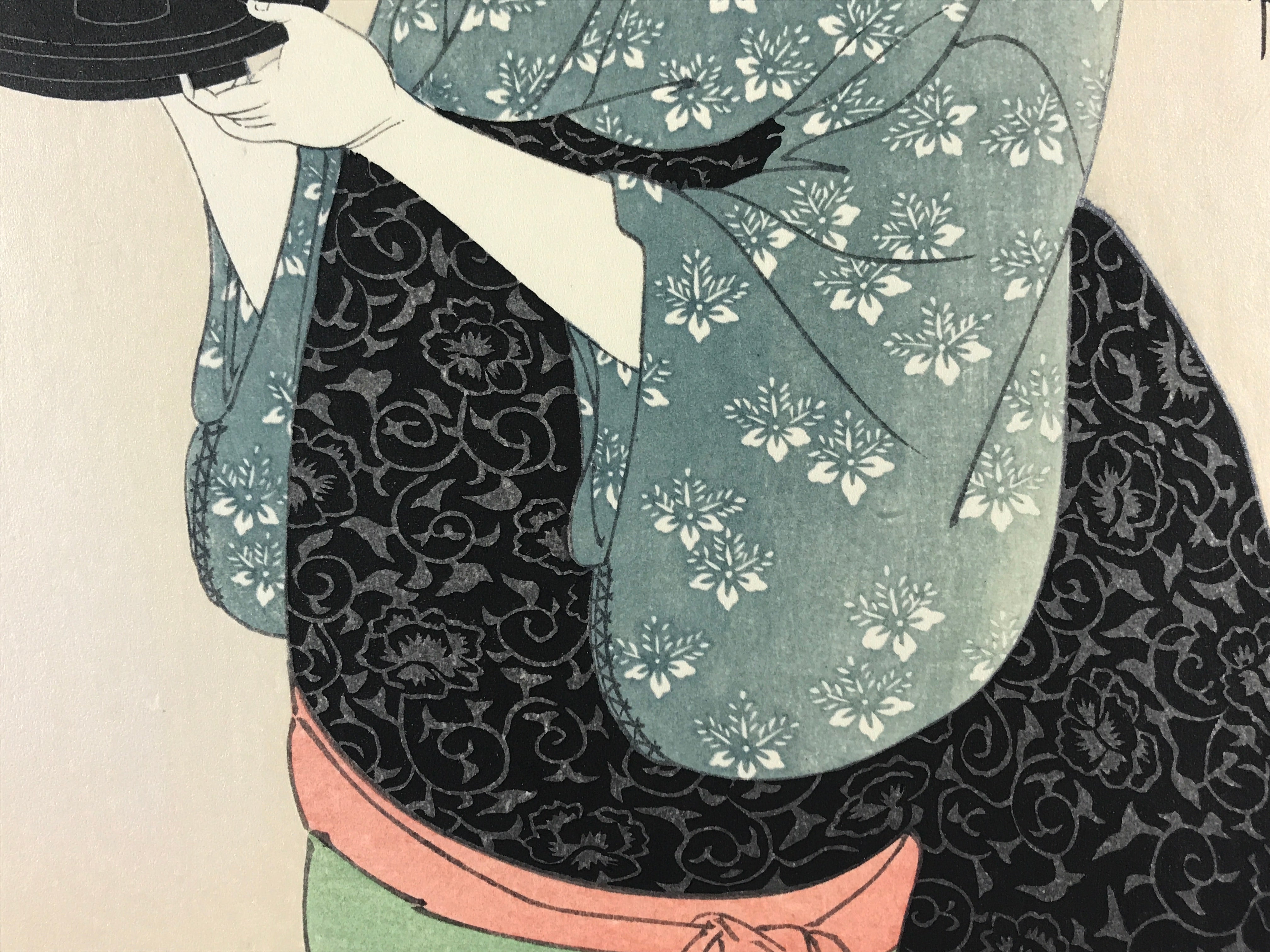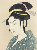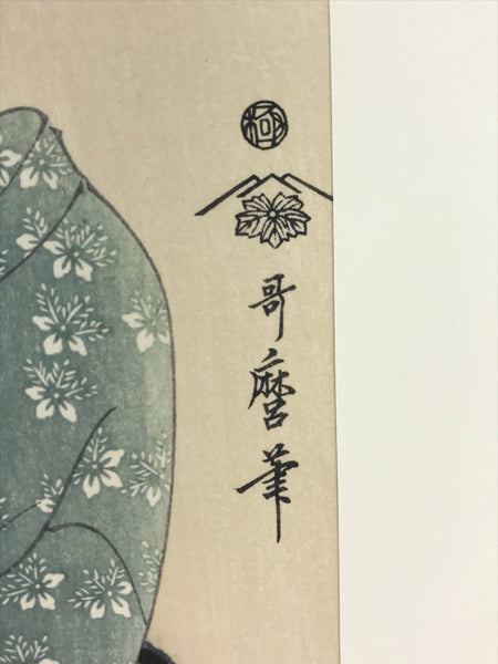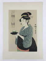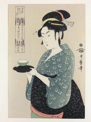 This is one of the 30 selections of vintage Utamaro Ukiyo-e woodblock printing published by Yuyudo. The title of the print is "難波屋おきた" Tea shop clerk. Kitagawa Utamaro was a Japanese artist. He is one of the most highly regarded designers of ukiyo-e woodblock prints and paintings and is best known for his "Bijin ōkubi-e, large-headed pictures of beautiful women" of the 1790s. He also produced illustrated books on insects.