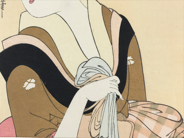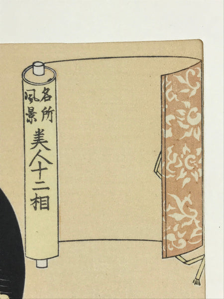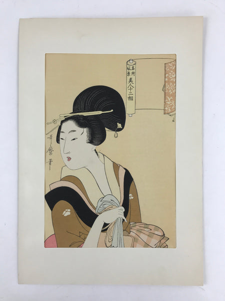 This is one of the 30 selections of vintage Utamaro Ukiyo-e woodblock printing published by Yuyudo. The title of the print is "名所風景 美人十二相" beautiful lady. Kitagawa Utamaro was a Japanese artist. He is one of the most highly regarded designers of ukiyo-e woodblock prints and paintings and is best known for his "Bijin ōkubi-e, large-headed pictures of beautiful women" of the 1790s. He also produced illustrated books on insects.