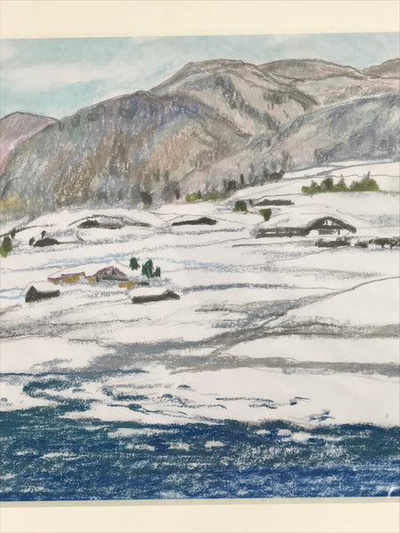 Japanese Riverside Village Snow Pastel Drawing Art Signed Yoshihiro Hagino FL326