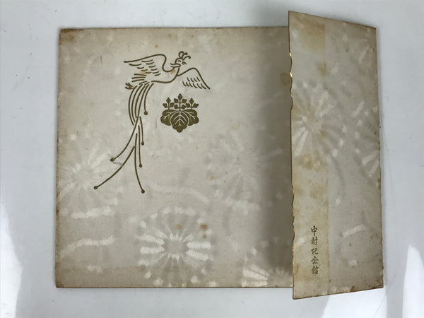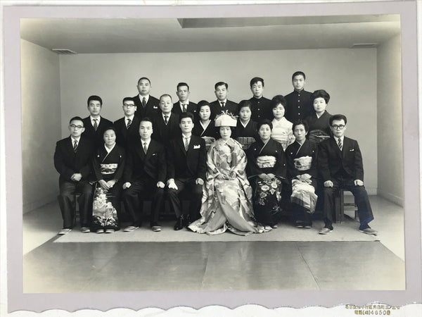 This is a vintage black and white wedding group photograph of a Japanese couple with family. The bride is wearing a traditional wedding-style kimono (uchikake), while the groom has opted for a suit with gloves. This photo comes stored in a beige washi paper folding cover with a gold paulownia flower and bird on the cover. The inside sheer paper cover has a red kanji character (寿 kotobuki, a celebratory word that means longevity).