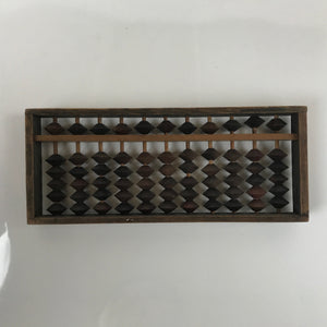 This is a vintage Japanese abacus, or soroban. It is a mathematics calculating tool and is considered the first calculator in Japan. The Japanese abacus is different from the parent Chinese version. It has a top section of single beads and a bottom of stacked beads usually five. At the very center is one unmarked stack used for decimal places for more complicated calculations. Many primary schools all over Japan still use these as well as for scorekeeping.