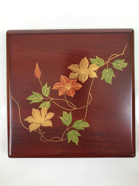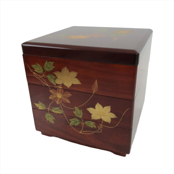 This is a Japanese vintage brushed lacquer wooden three-tier lunch box (jubako). The box is a gorgeous medium brown color with a glossy clear coat finish. The top two tiers can be arranged in any fashion. The bottom piece has a decorative base and the entire piece is painted with gold and green makie flowers (kikyo, balloon flower). This item was a commemoration gift. It comes with the original paper box.